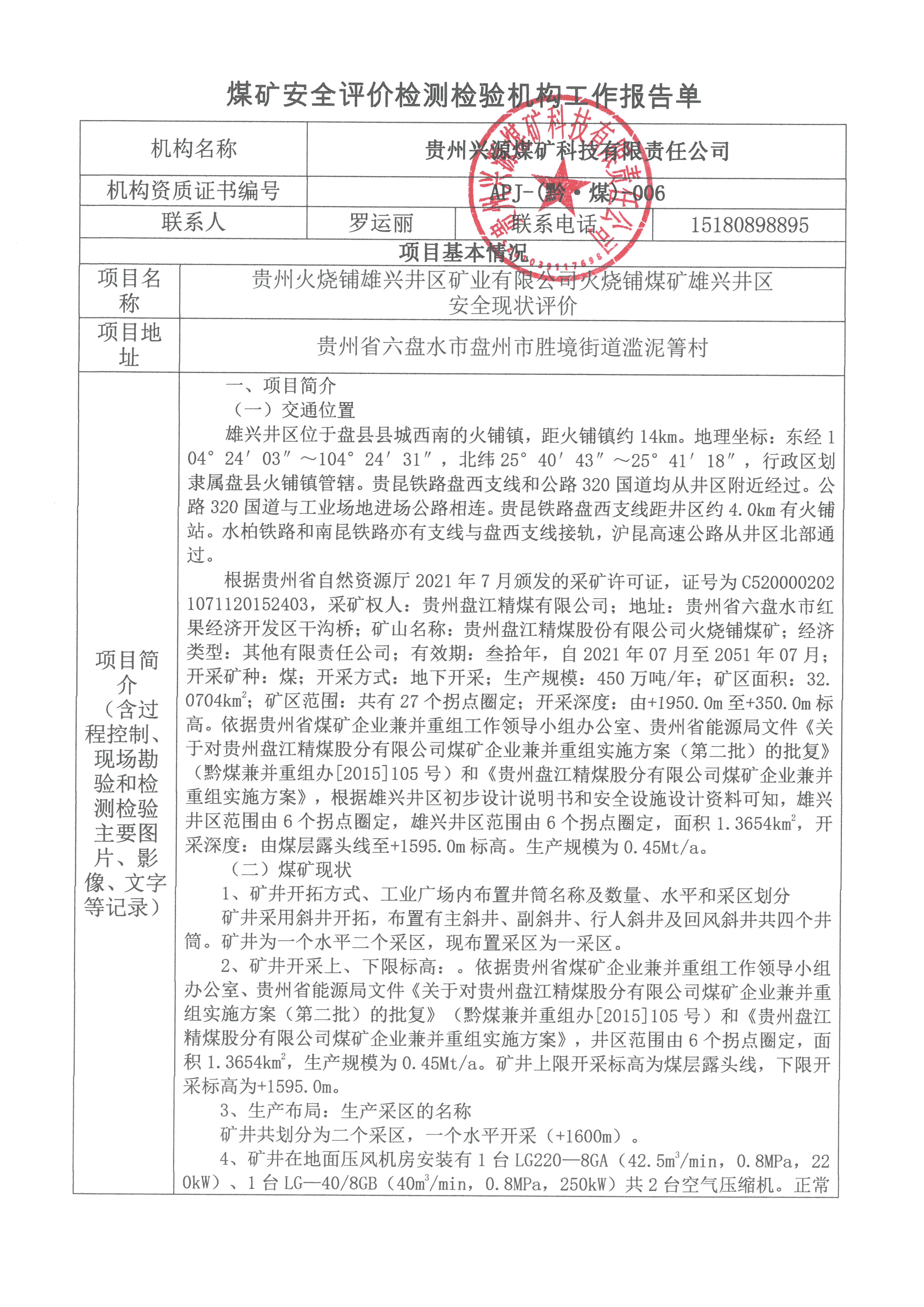 煤礦安全評價檢測檢驗機構工作報告單【貴州火燒鋪雄興井區(qū)礦業(yè)有限公司火燒鋪煤礦雄興井區(qū)安全現(xiàn)狀評價】