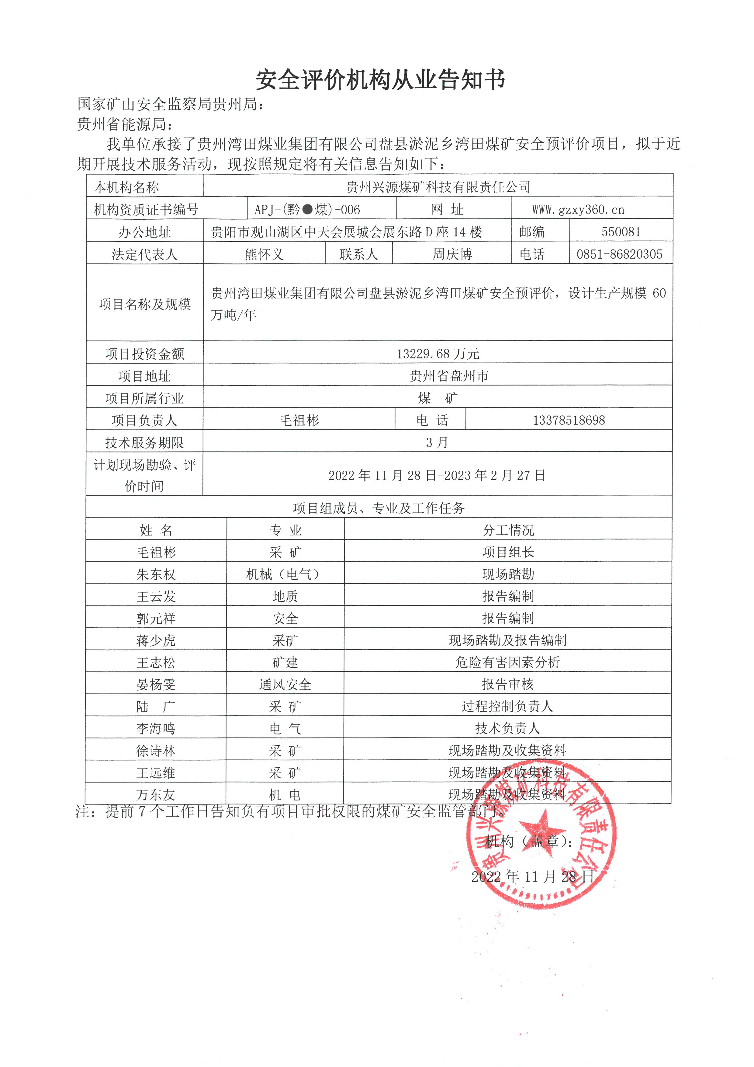 安全評價(jià)機(jī)構(gòu)從業(yè)告知書【貴州灣田煤業(yè)集團(tuán)有限公司盤縣淤泥鄉(xiāng)灣田煤礦】