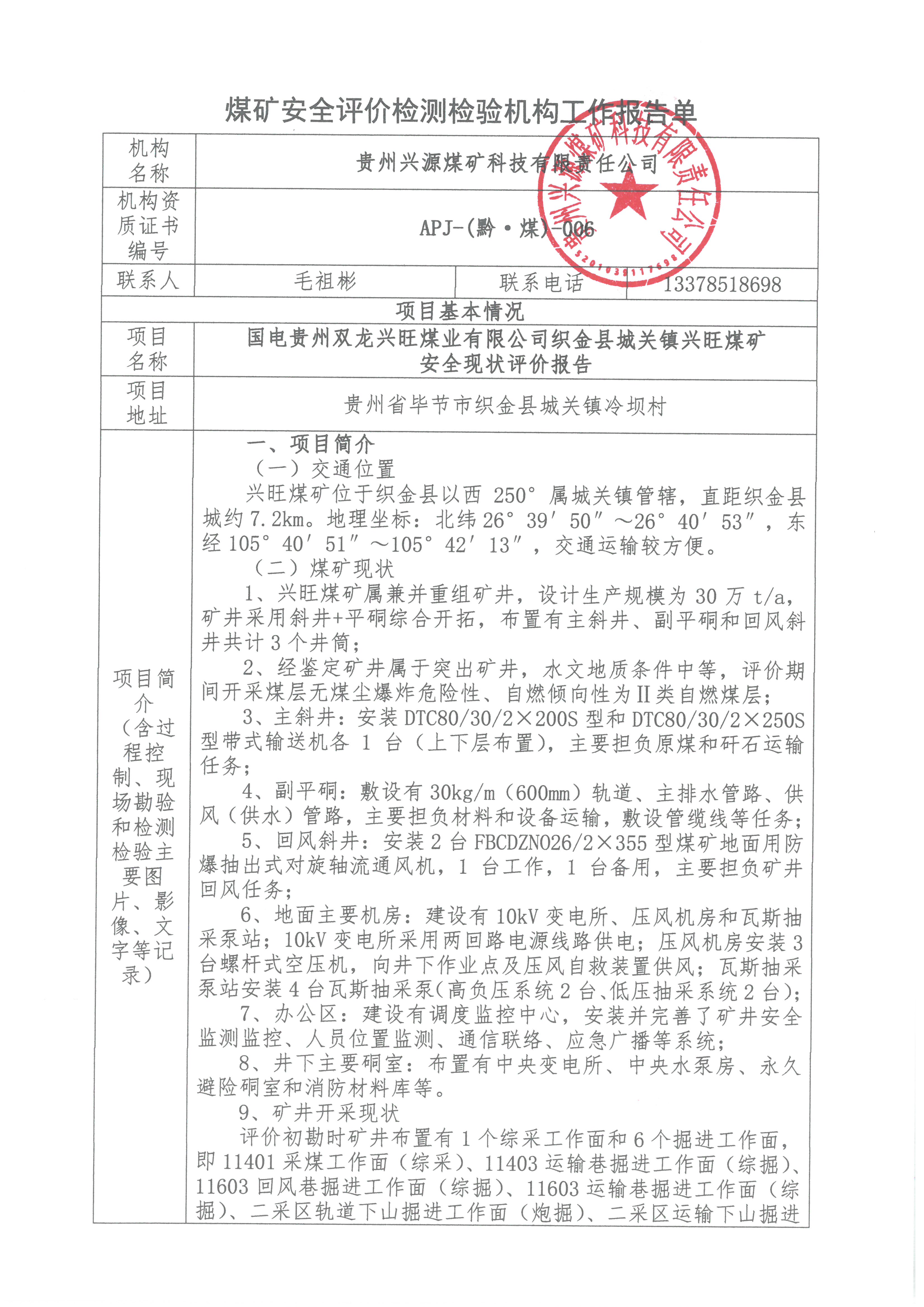 煤礦安全評(píng)價(jià)檢測檢驗(yàn)機(jī)構(gòu)工作報(bào)告單【國電貴州雙龍興旺煤業(yè)有限公司織金縣城關(guān)鎮(zhèn)興旺煤礦安全現(xiàn)狀評(píng)價(jià)報(bào)告】