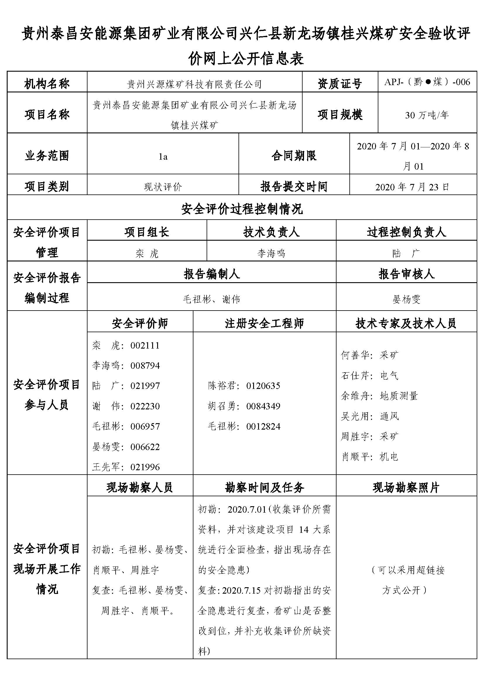 貴州泰昌安能源集團礦業(yè)有限公司興仁縣新龍場鎮(zhèn)桂興煤礦安全驗收評價網(wǎng)上公開信息表