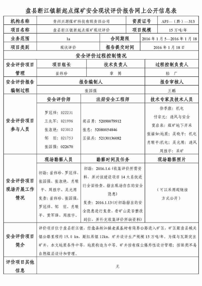 盤縣斷江鎮(zhèn)新起點(diǎn)煤礦安全現(xiàn)狀評價(jià)報(bào)告網(wǎng)上公開信息表