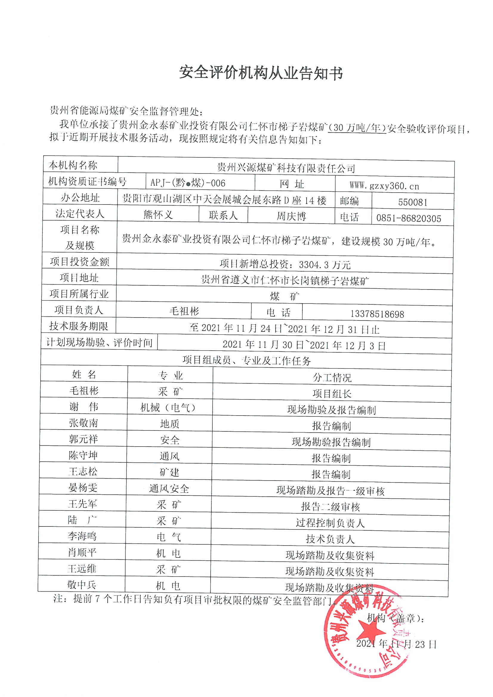 安全評(píng)價(jià)機(jī)構(gòu)從業(yè)告知書(貴州金永泰礦業(yè)投資有限公司仁懷市梯子巖煤礦(30萬(wàn)噸/ 年)安全驗(yàn)收評(píng)價(jià))