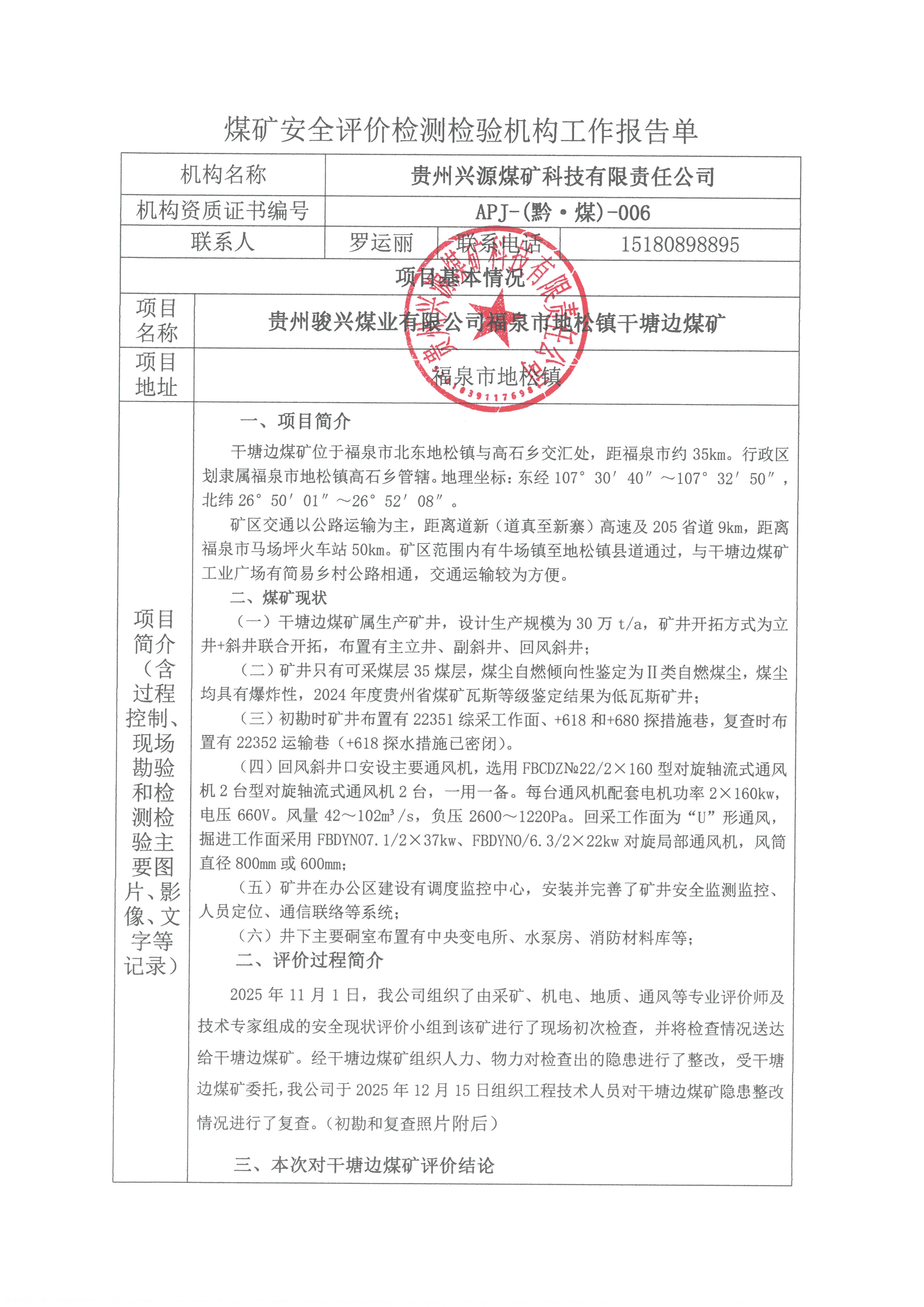 煤礦安全評(píng)價(jià)檢測(cè)檢驗(yàn)機(jī)構(gòu)工作報(bào)告單【貴州竣興煤業(yè)有限公司福泉市地松鎮(zhèn)干塘邊煤礦】