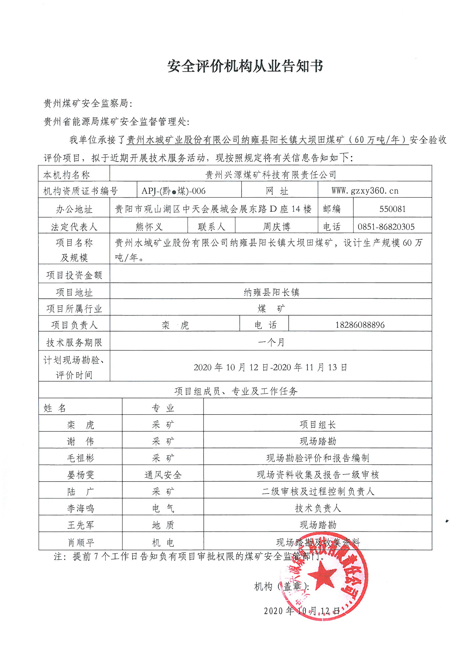 安全評價機構(gòu)從業(yè)告知書(貴州水城礦業(yè)股份有限公司納雍縣陽長鎮(zhèn)大壩田煤礦)