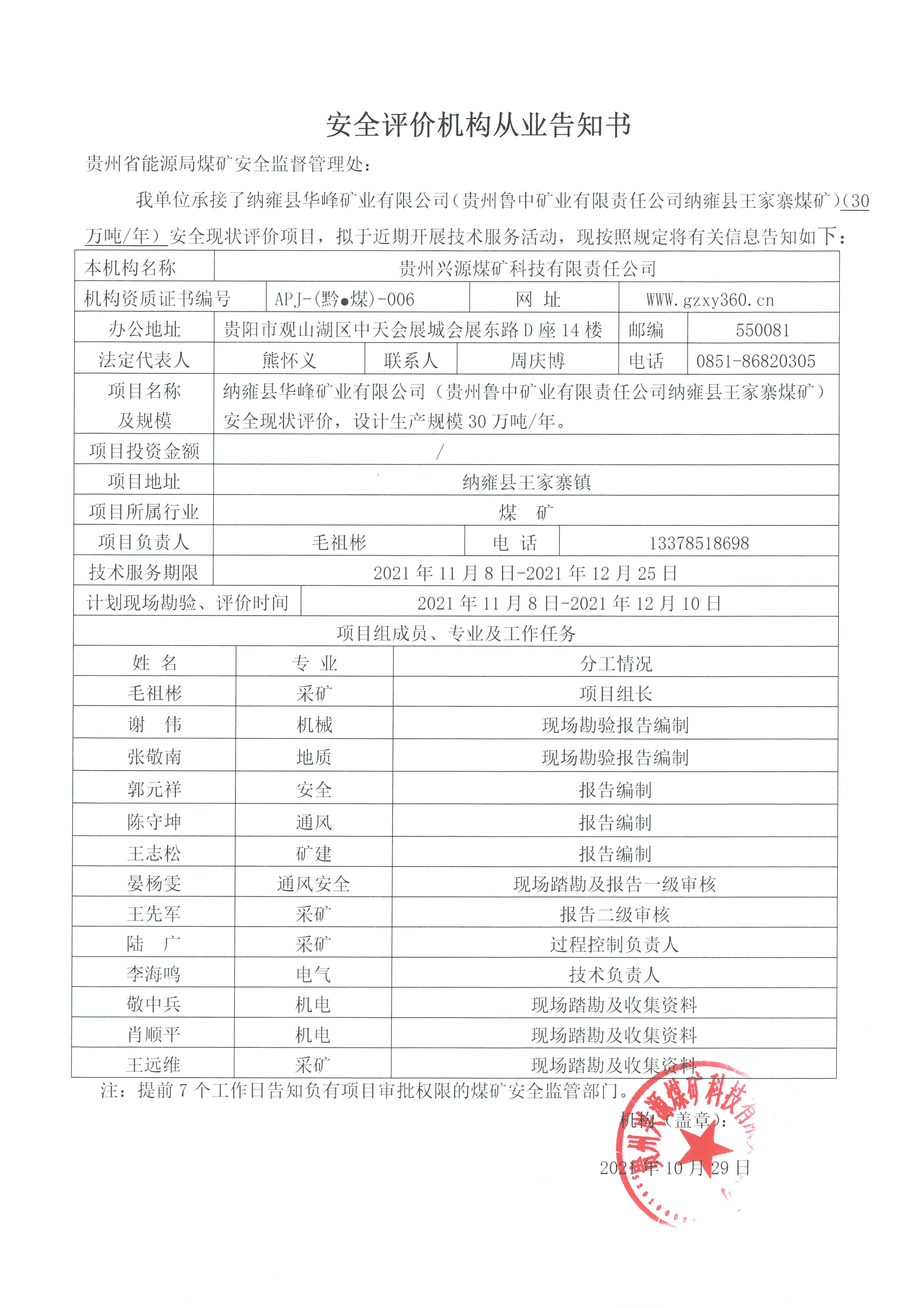 安全評價機構(gòu)從業(yè)告知書(納雍縣華峰礦業(yè)有限公司(貴州魯中礦業(yè)有限責(zé)任公司納雍縣王家寨煤礦)(30萬噸年)安全現(xiàn)狀評價)