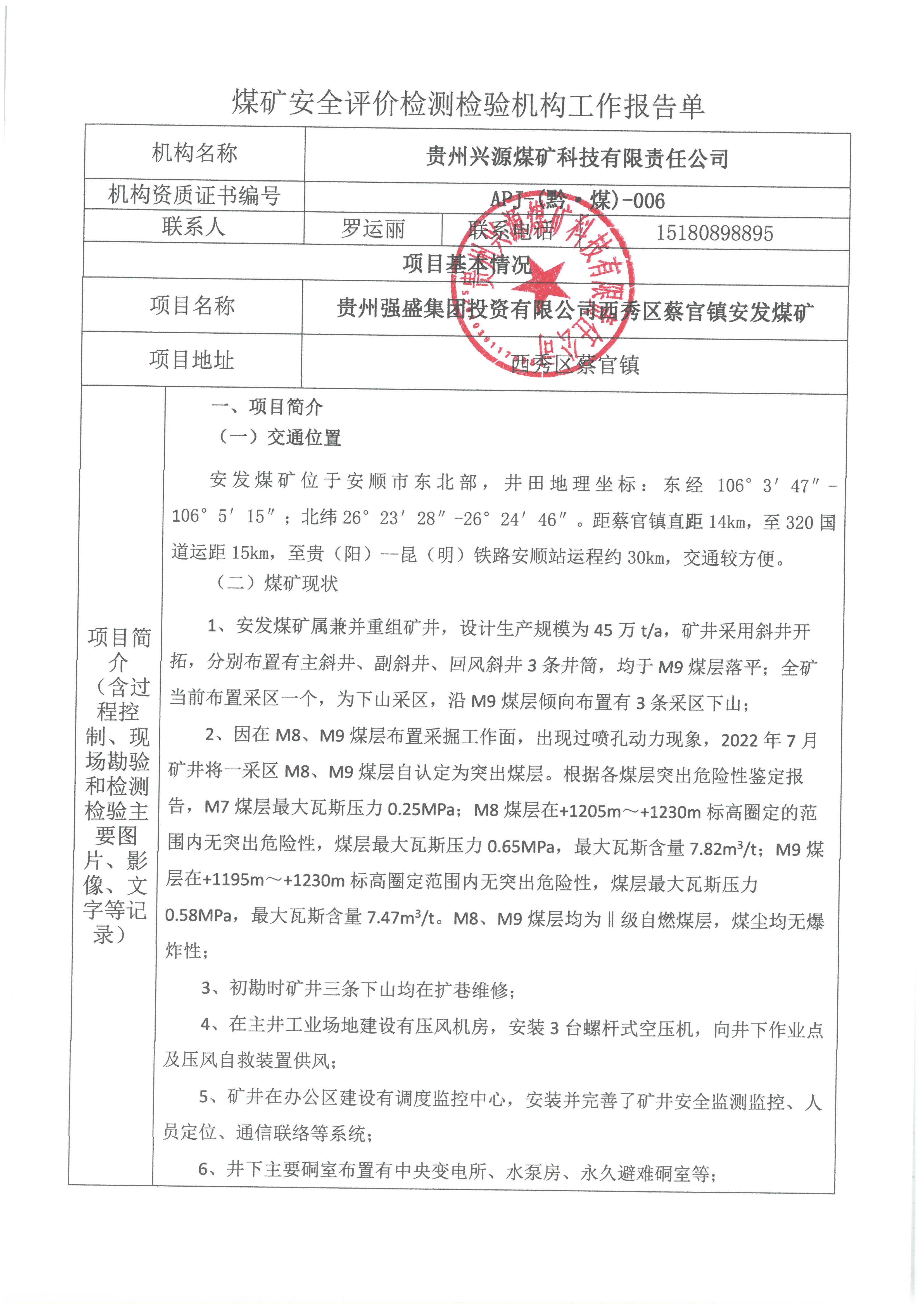 煤礦安全評價檢測檢驗機構(gòu)工作報告單【貴州強盛集團投資有限公司西秀區(qū)蔡官鎮(zhèn)安發(fā)煤礦】