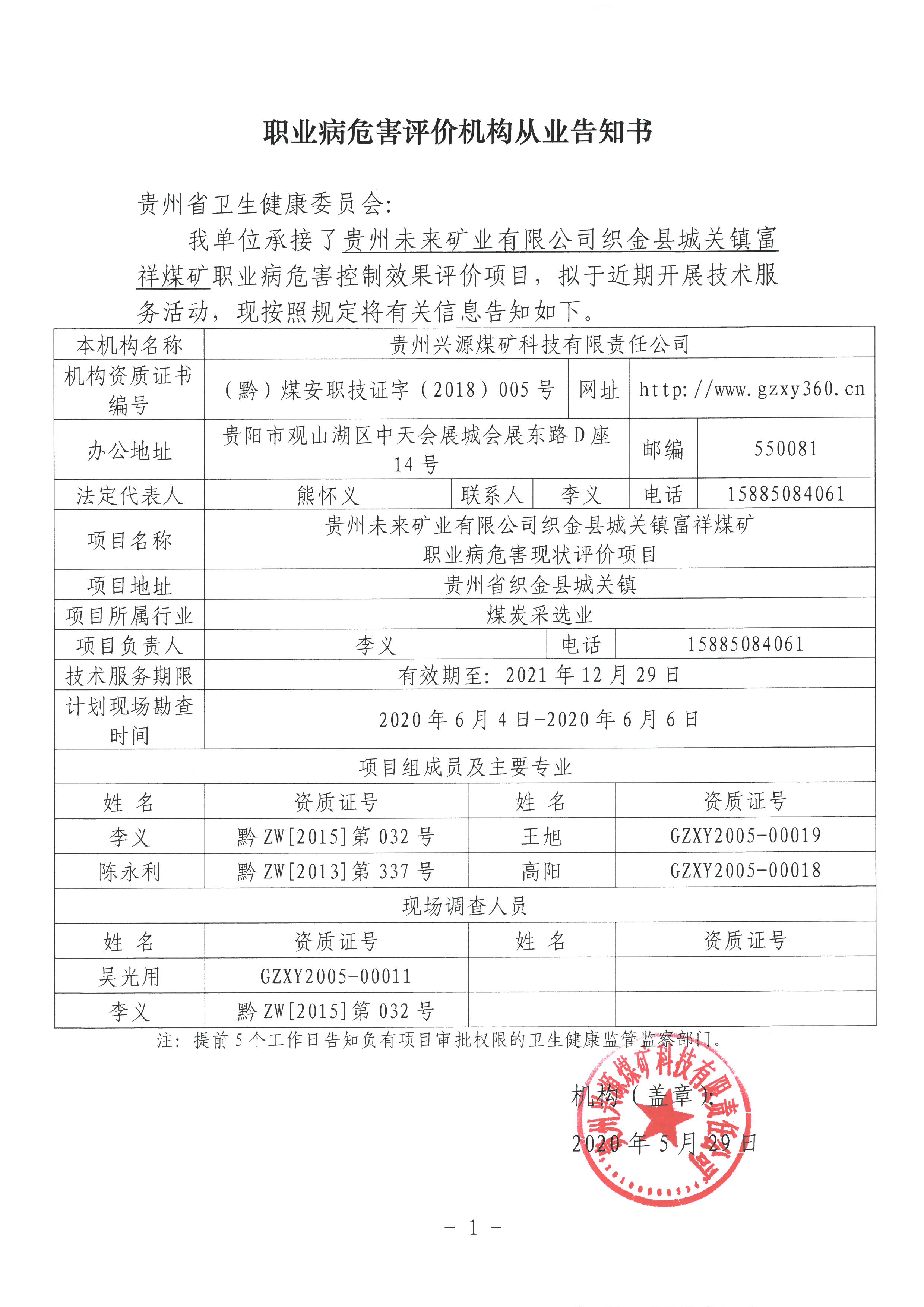 職業(yè)病危害評(píng)價(jià)機(jī)構(gòu)從業(yè)告知書(shū)[貴州未來(lái)礦業(yè)有限公司織金縣城關(guān)鎮(zhèn)富祥煤礦]
