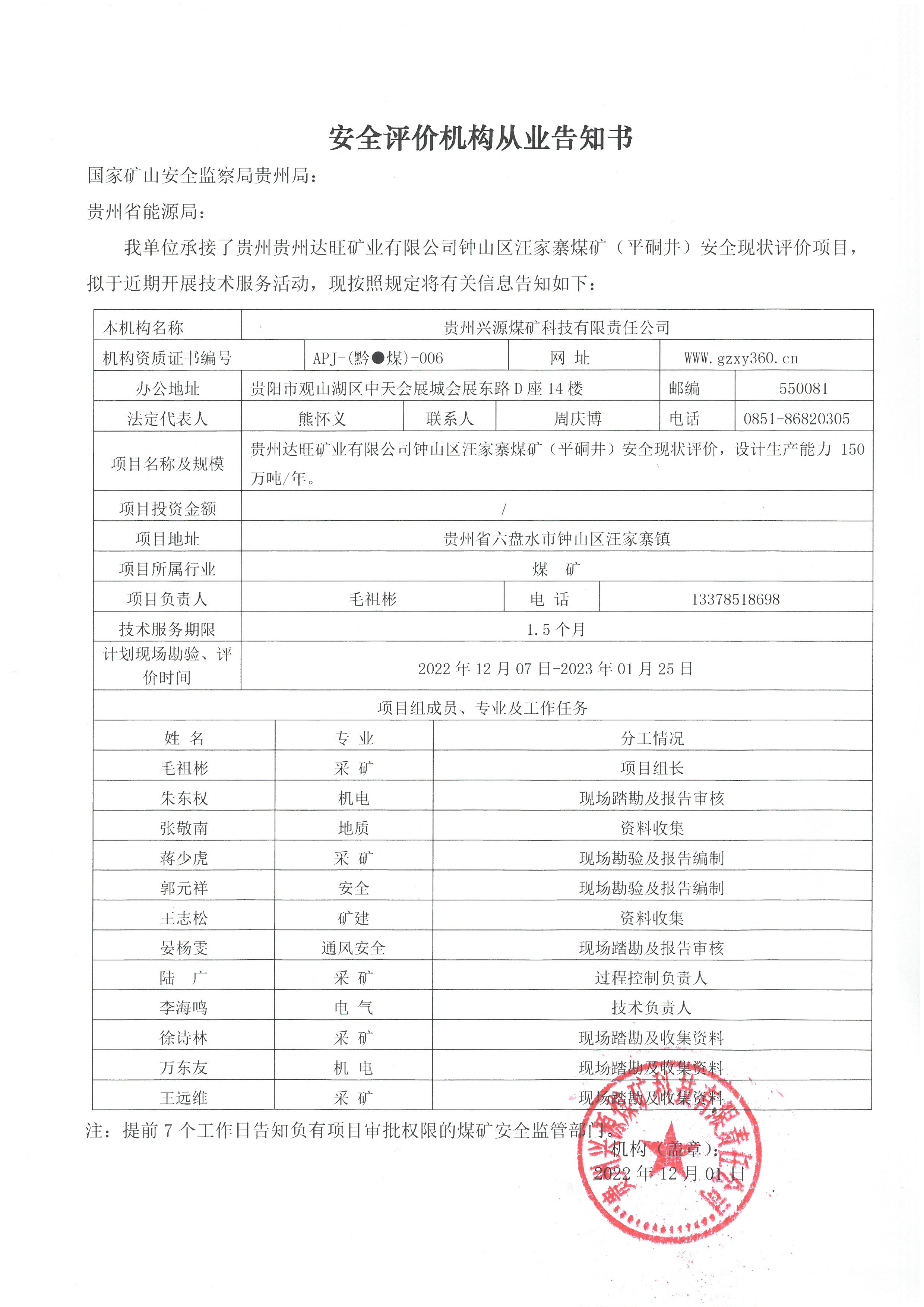 安全評(píng)價(jià)機(jī)構(gòu)從業(yè)告知書【貴州貴州達(dá)旺礦業(yè)有限公司鐘山區(qū)汪家寨煤礦(平硐井)安全現(xiàn)狀評(píng)價(jià)項(xiàng)目】
