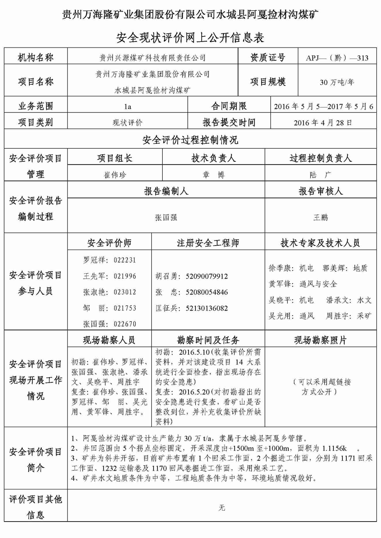 貴州萬海隆礦業(yè)集團股份有限公司水城縣阿戛撿材溝煤礦安全現(xiàn)狀評價網(wǎng)上公開信息表