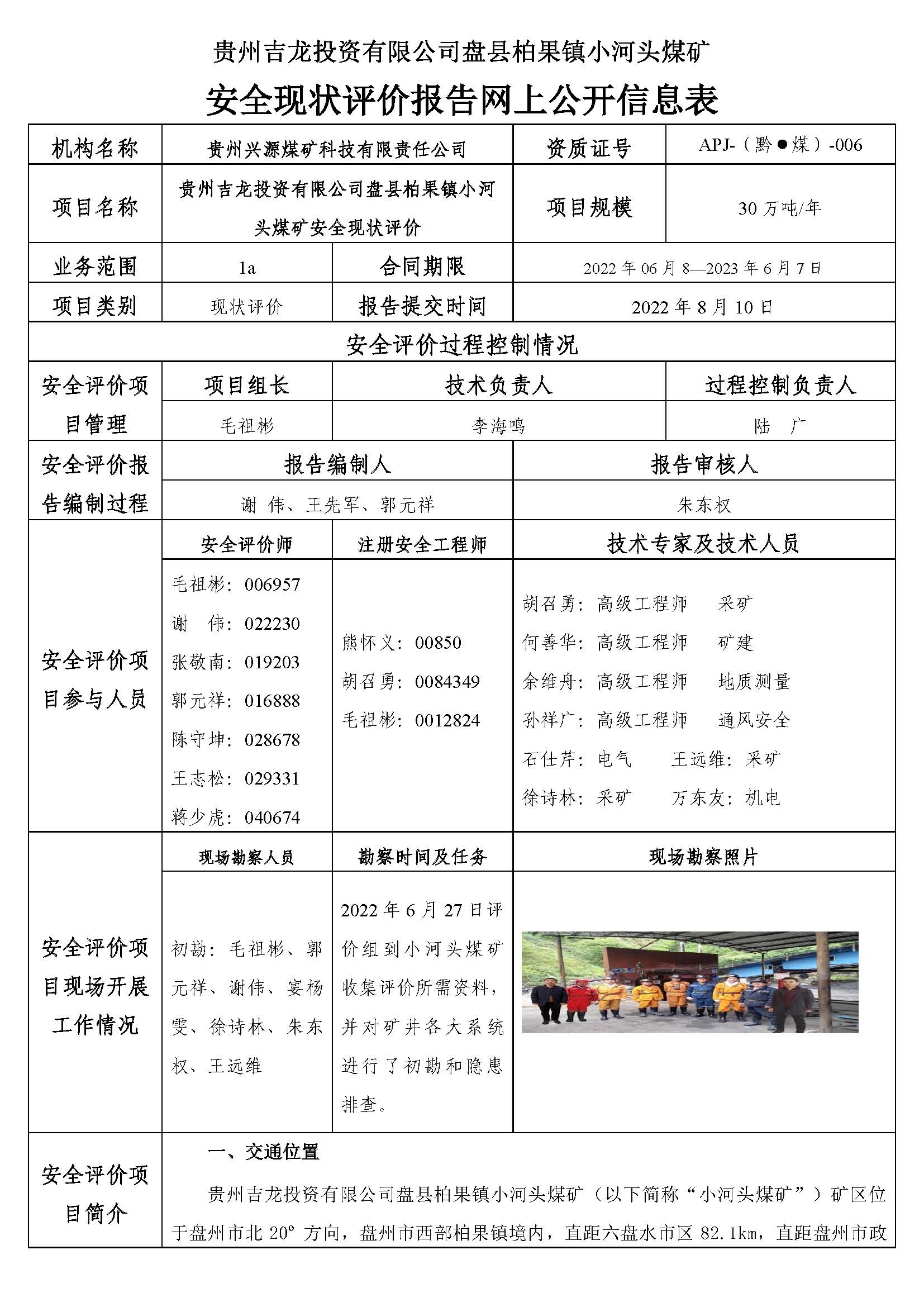 貴州吉龍投資有限公司盤縣柏果鎮(zhèn)小河頭煤礦安全現(xiàn)狀評價報告網(wǎng)上公開信息表