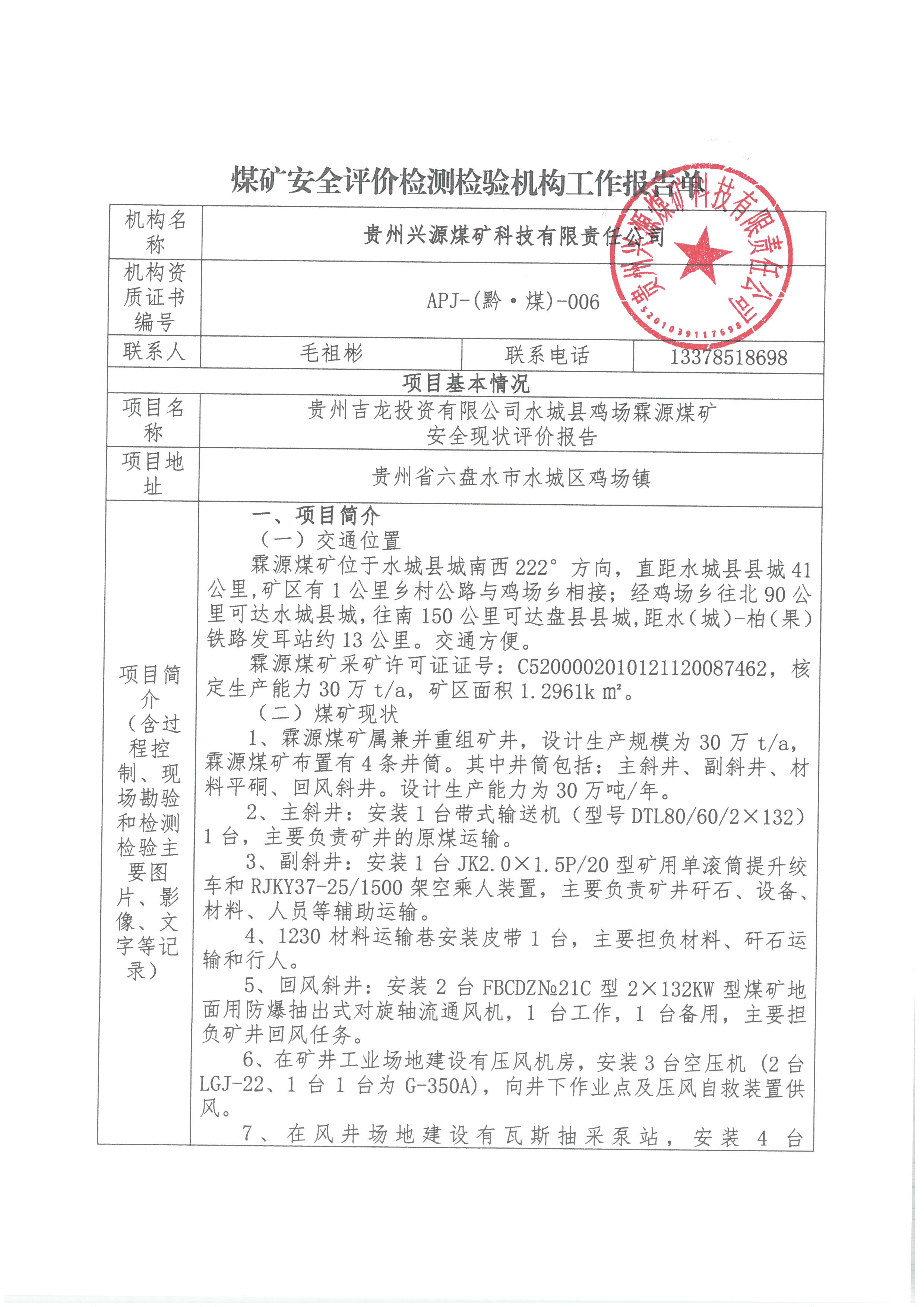 煤礦安全評價檢測檢驗機構(gòu)工作報告單【貴州吉龍投資有限公司水城縣雞場霖源煤礦安全現(xiàn)狀評價報告】
