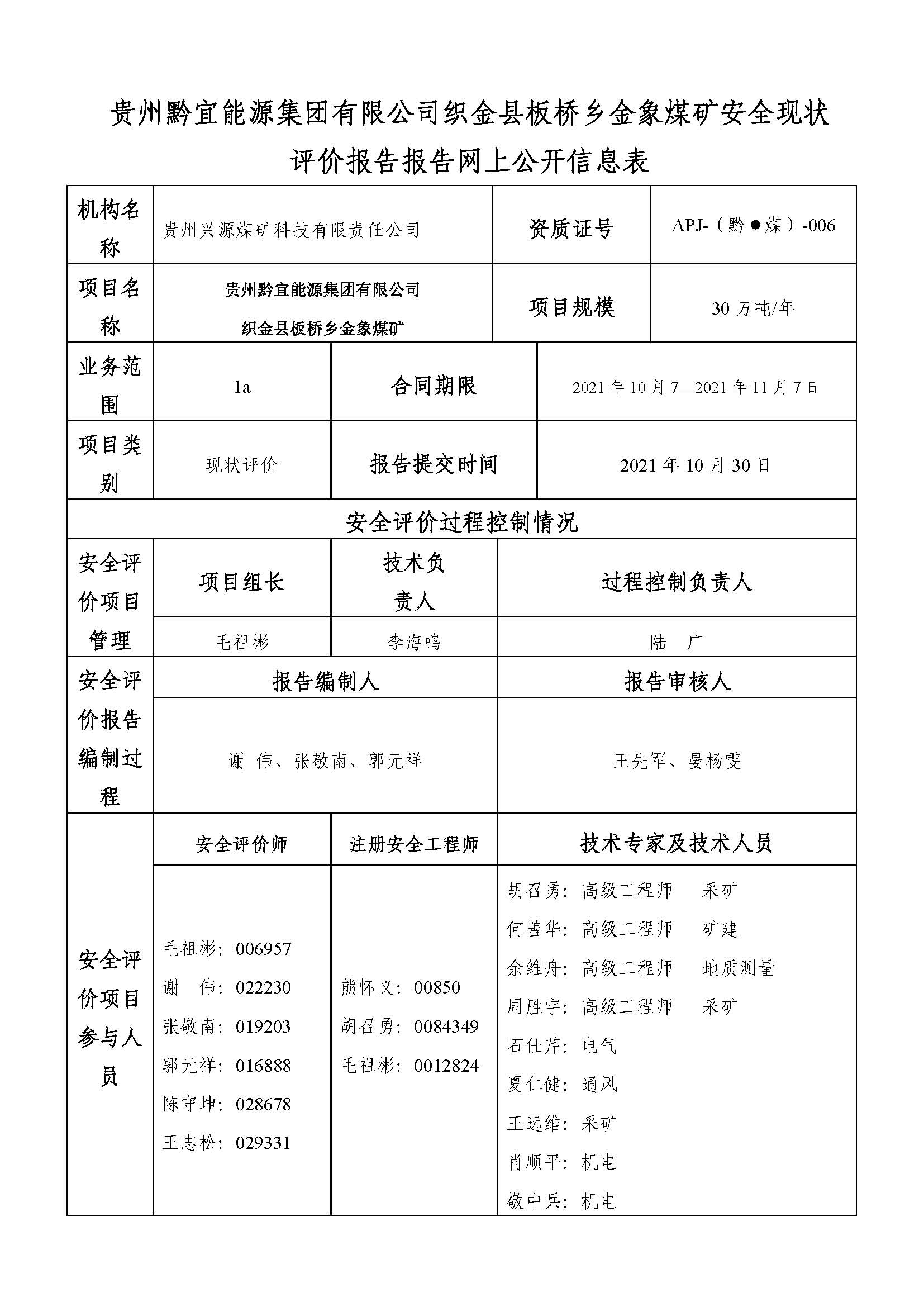 貴州黔宜能源集團(tuán)有限公司織金縣板橋鄉(xiāng)金象煤礦安全現(xiàn)狀評價報告報告網(wǎng)上公開信息表