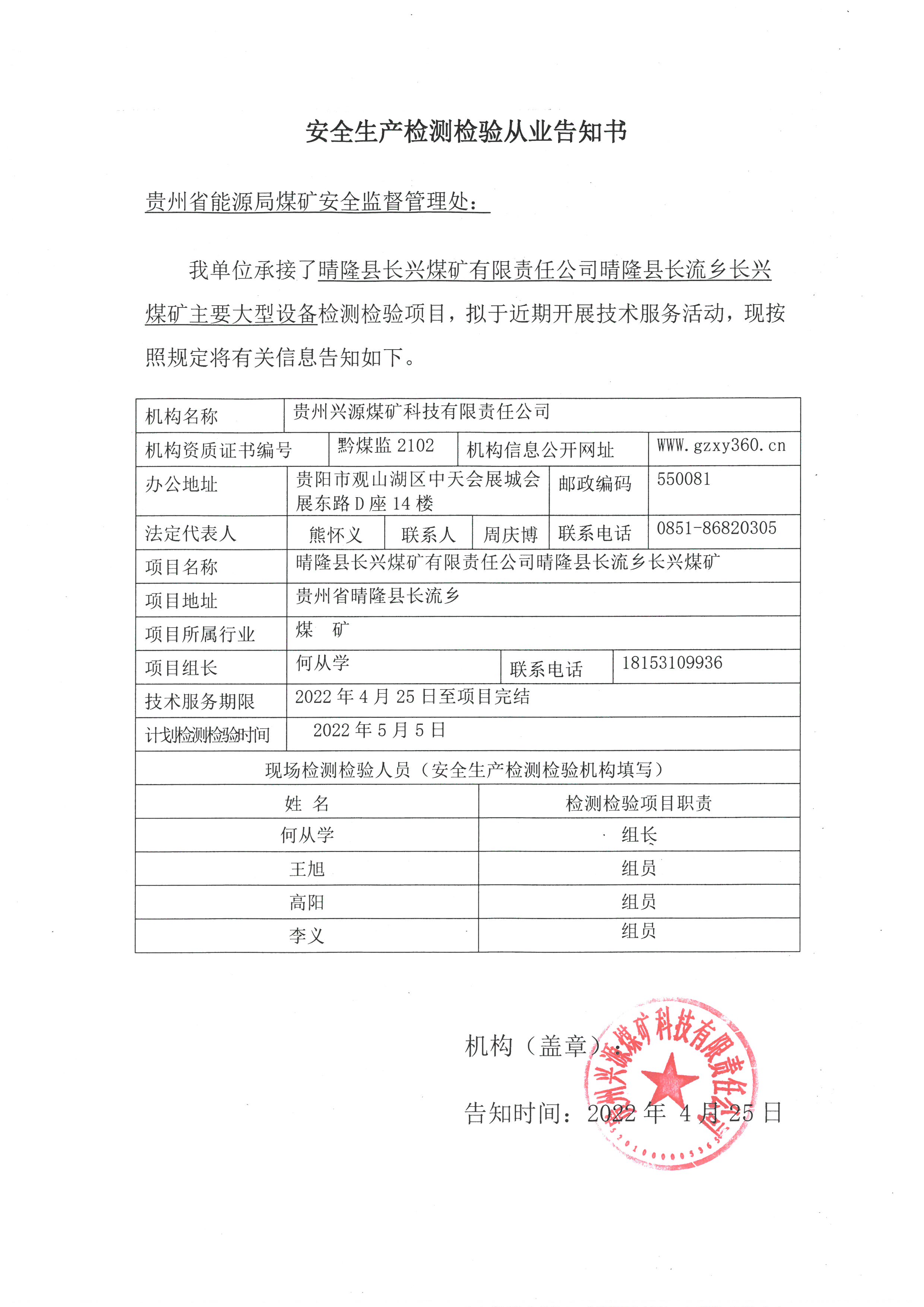 安全生產(chǎn)檢測檢驗(yàn)從業(yè)告知書【晴隆縣長興煤礦有限責(zé)任公司晴隆縣長流鄉(xiāng)長興煤】