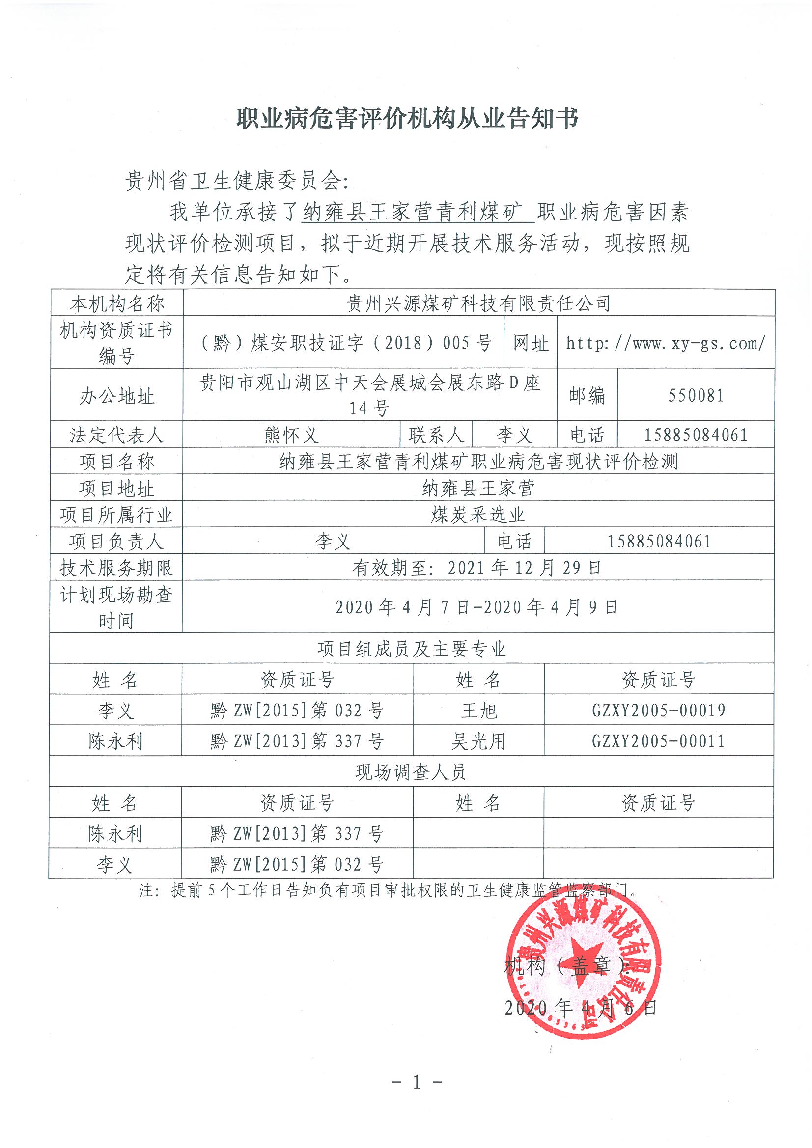職業(yè)病危害評價機構(gòu)從業(yè)告知書[納雍縣王家營青利煤礦]