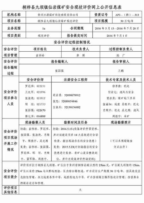 桐梓縣九壩鎮(zhèn)仙巖煤礦安全現(xiàn)狀評價(jià)網(wǎng)上公開信息表