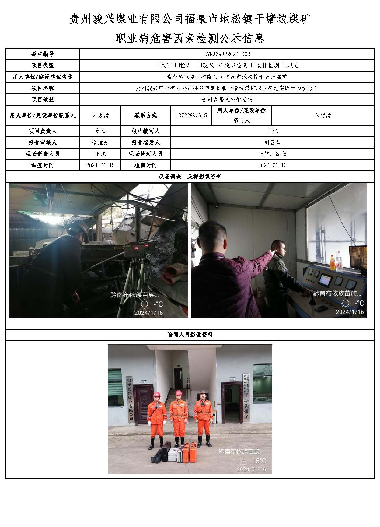 貴州駿興煤業(yè)有限公司福泉市地松鎮(zhèn)干塘邊煤礦職業(yè)病危害因素檢測公示信息