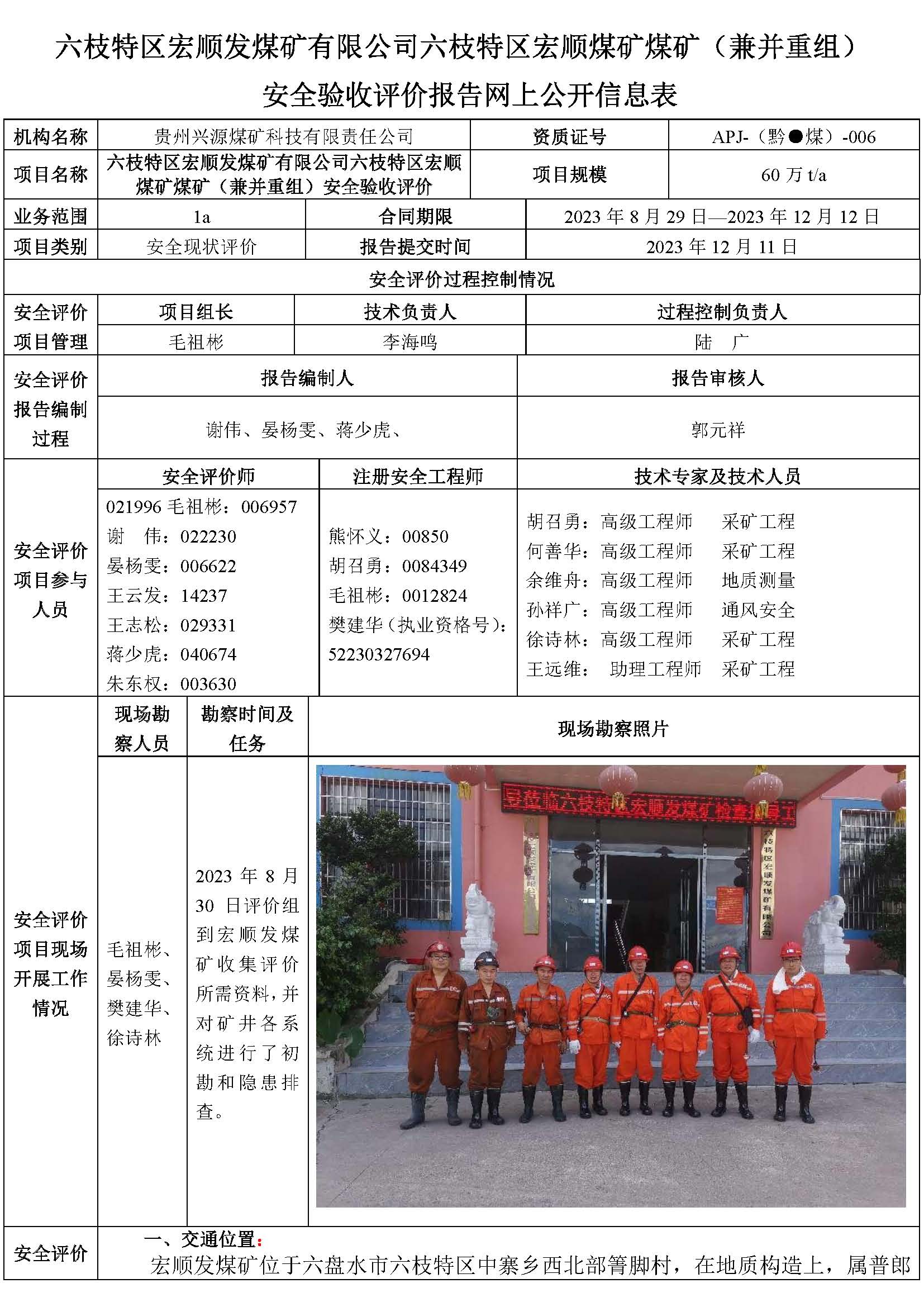 六枝特區(qū)宏順發(fā)煤礦有限公司六枝特區(qū)宏順煤礦煤礦(兼并重組) 安全驗收評價報告網(wǎng)上公開信息表