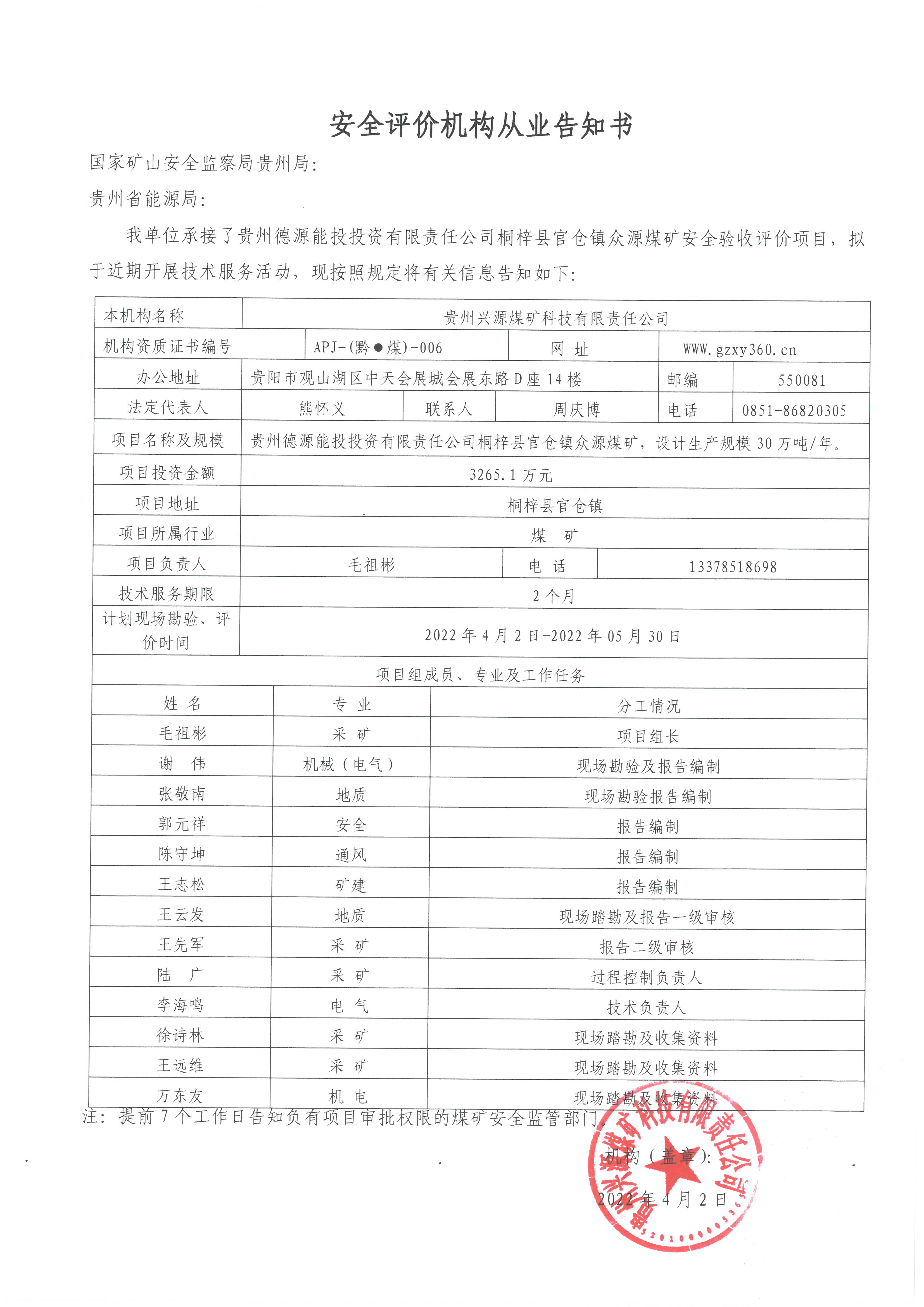 安全評(píng)價(jià)機(jī)構(gòu)從業(yè)告知書(貴州德源能投投資有限責(zé)任公司桐梓縣官倉(cāng)鎮(zhèn)眾源煤礦安全驗(yàn)收評(píng)價(jià))