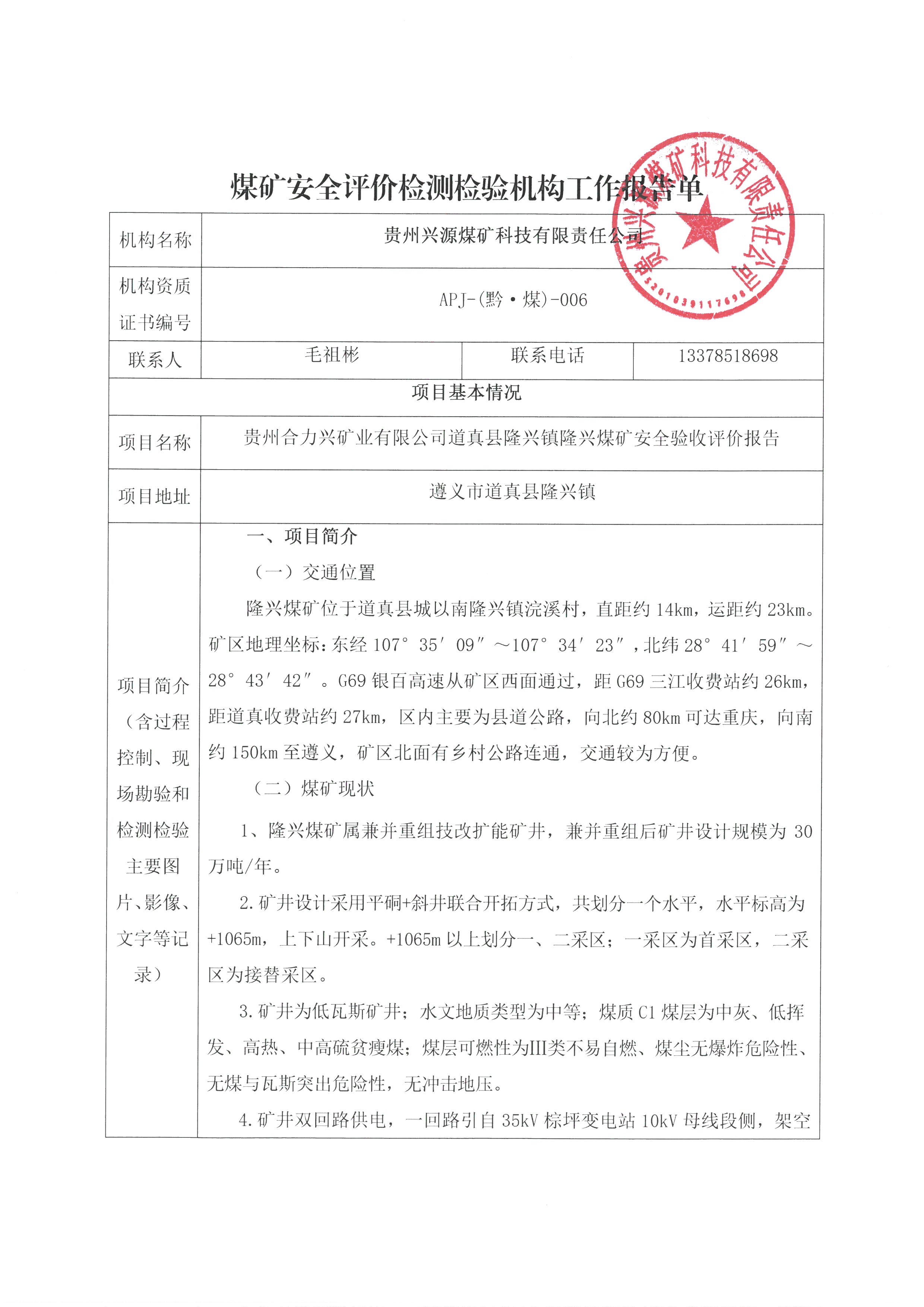 煤礦安全評(píng)價(jià)檢測(cè)檢驗(yàn)機(jī)構(gòu)工作報(bào)告單【貴州合力興礦業(yè)有限公司道真縣隆興鎮(zhèn)隆興煤礦安全驗(yàn)收評(píng)價(jià)報(bào)告】