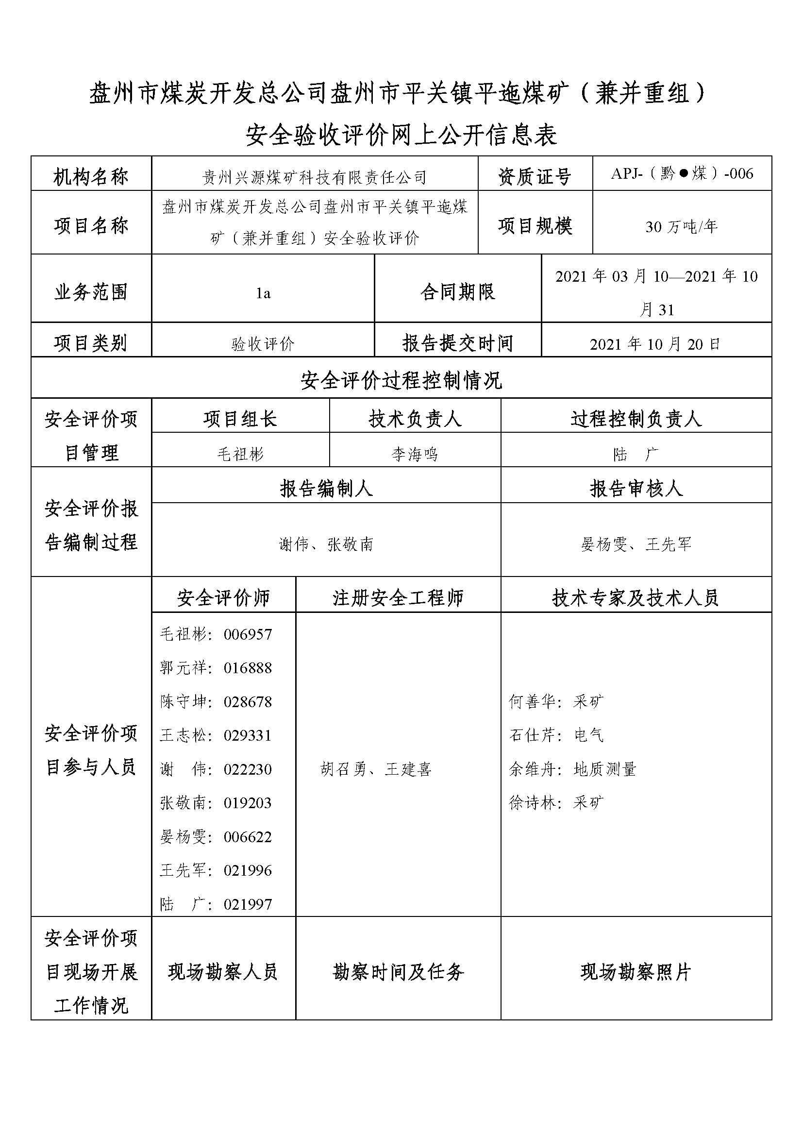 盤州市煤炭開發(fā)總公司盤州市平關(guān)鎮(zhèn)平迤煤礦(兼并重組)安全驗收評價網(wǎng)上公開信息表