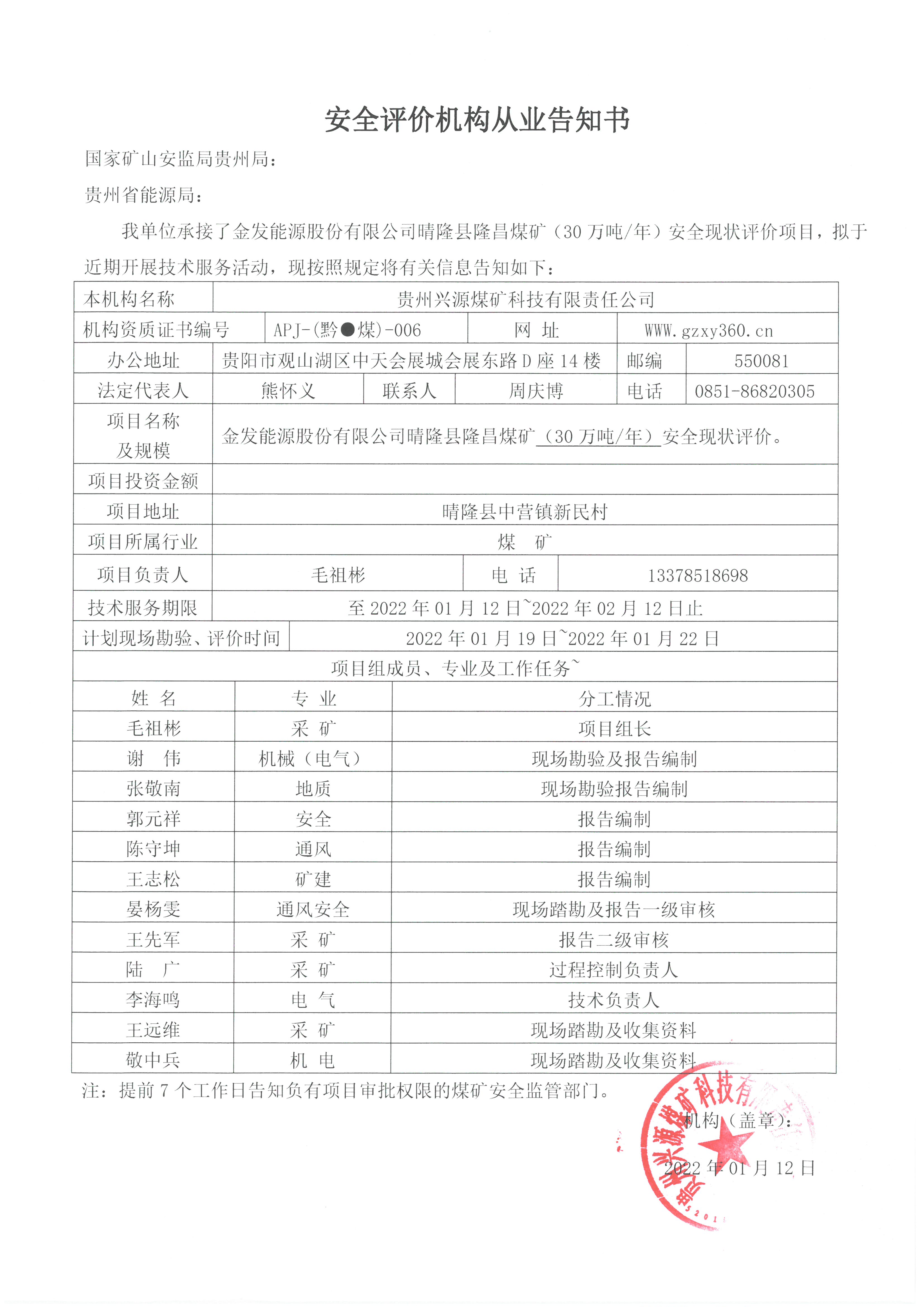 安全評價機構(gòu)從業(yè)告知書(金發(fā)能源股份有限公司晴隆縣隆昌煤礦)