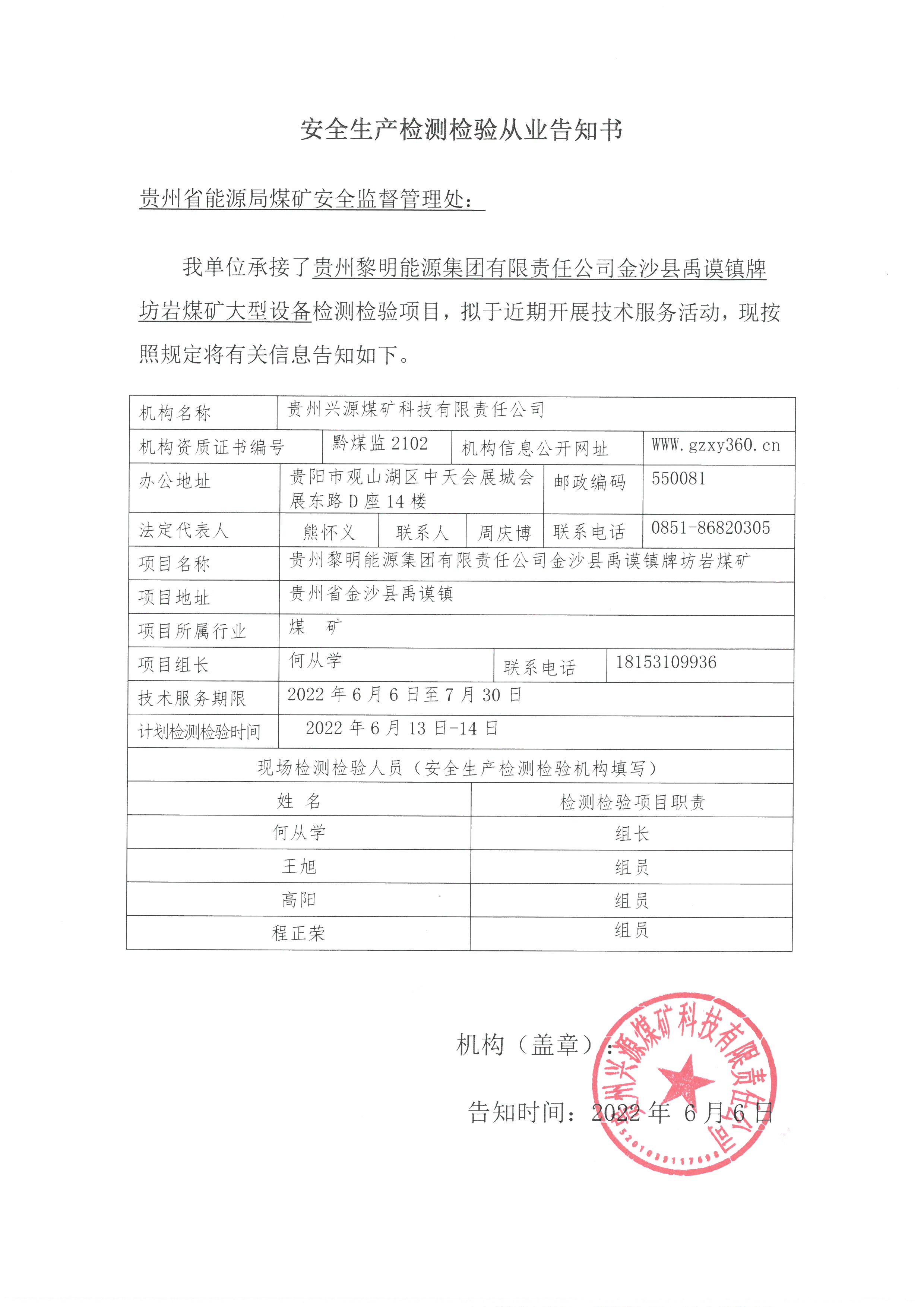 安全生產(chǎn)檢測檢驗從業(yè)告知書【貴州黎明能源集團有限責任公司金沙縣禹謨鎮(zhèn)牌坊巖煤礦】