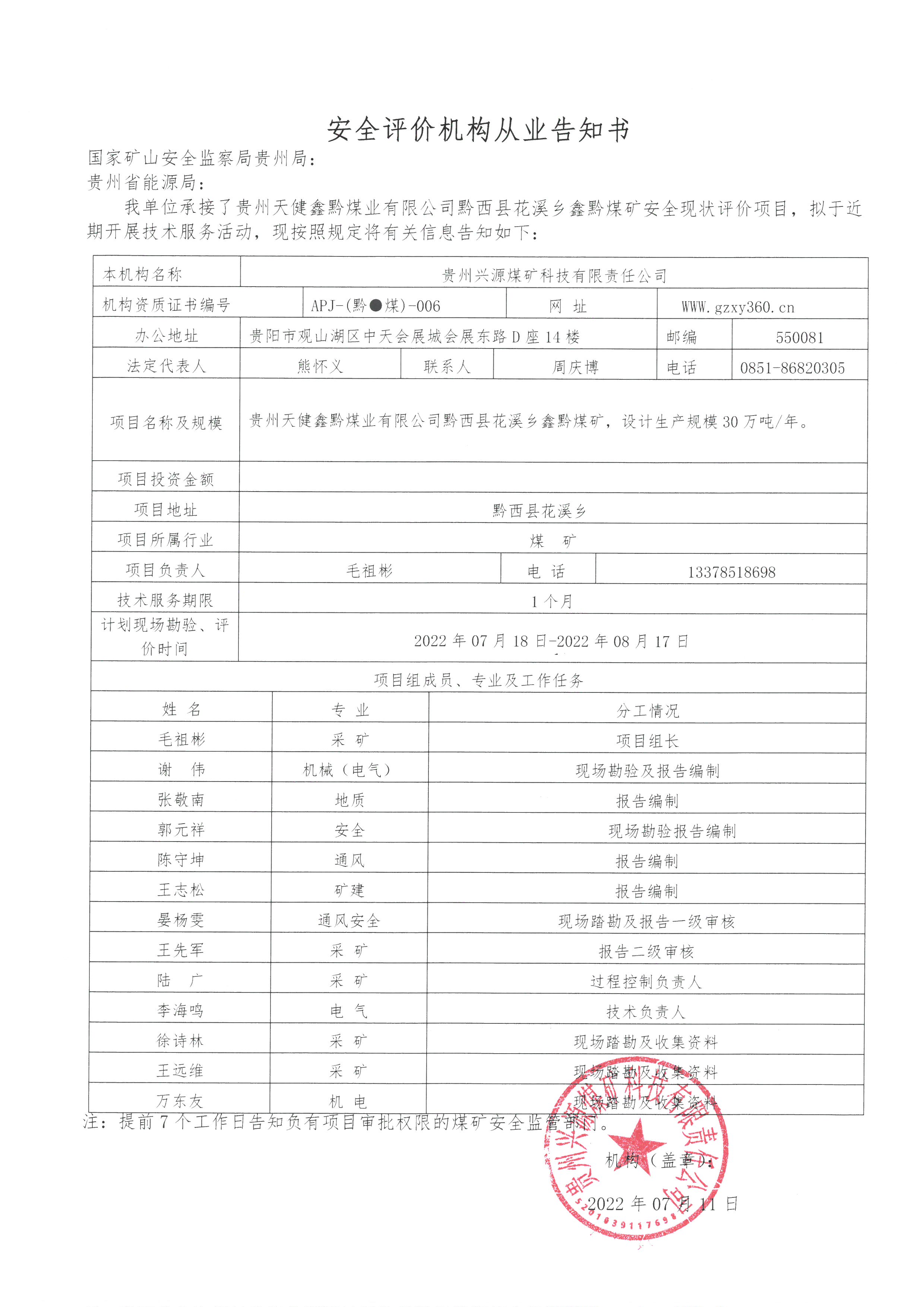 安全評價機構(gòu)從業(yè)告知書【貴州天健鑫黔煤業(yè)有限公司黔西縣花溪鄉(xiāng)鑫黔煤礦】