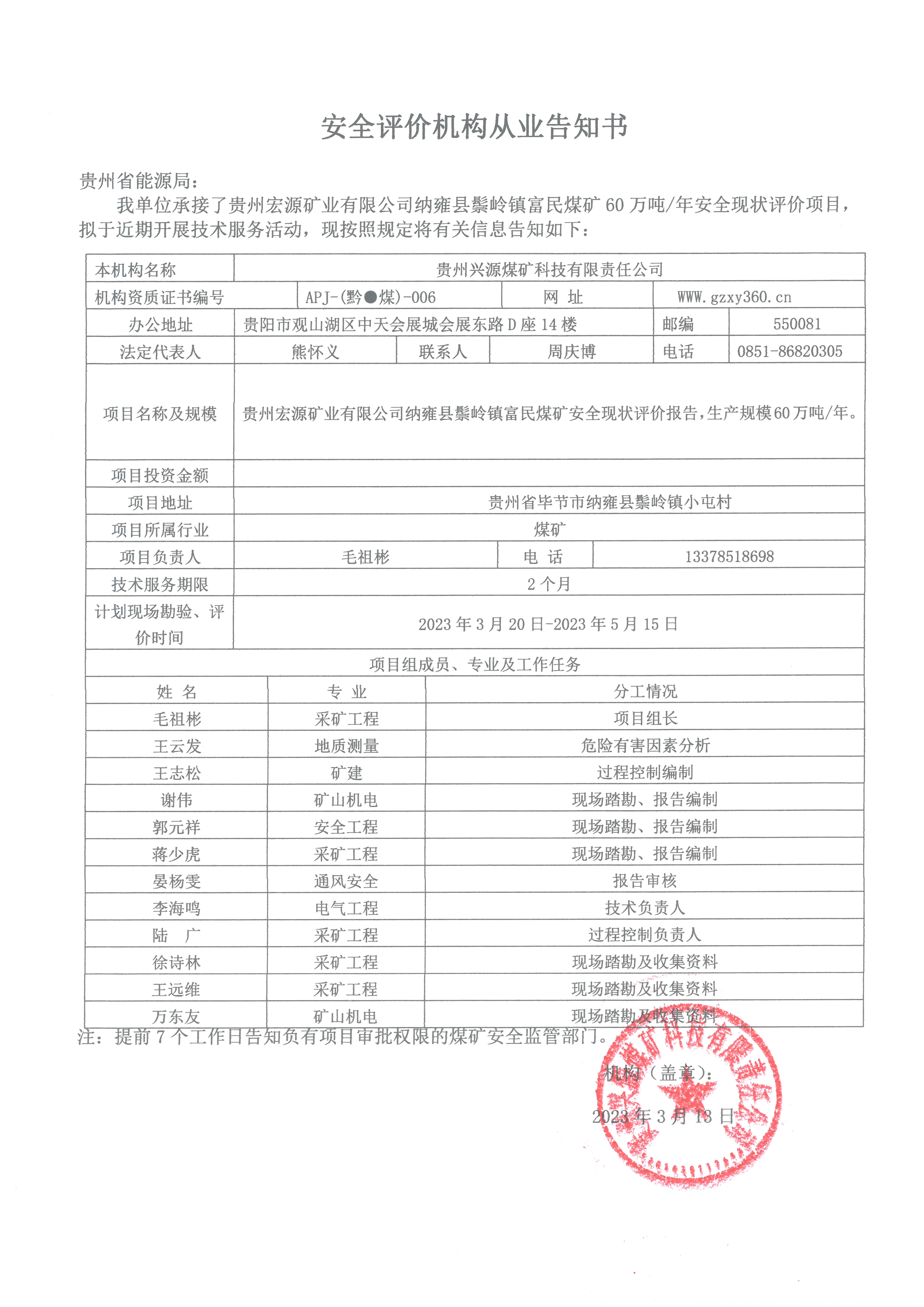 安全評(píng)價(jià)機(jī)構(gòu)從業(yè)告知書【貴州宏源礦業(yè)有限公司納雍縣鬃嶺鎮(zhèn)富民煤礦】