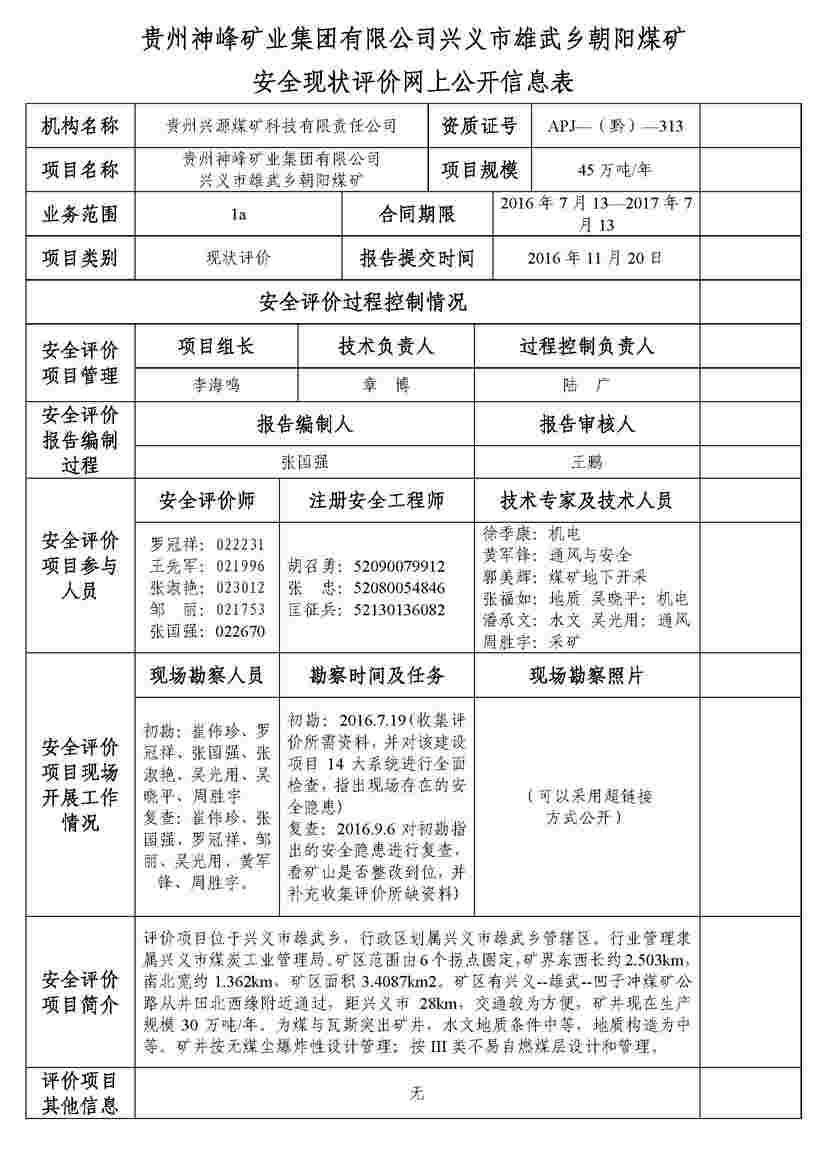 貴州神峰礦業(yè)集團(tuán)有限公司興義市雄武鄉(xiāng)朝陽煤礦安全現(xiàn)狀評價網(wǎng)上公開信息表