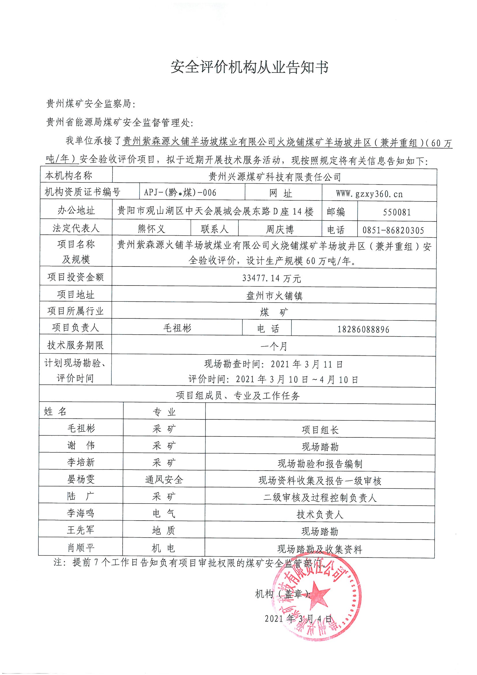 安全評價機(jī)構(gòu)從業(yè)告知書(貴州紫森源火鋪羊場坡煤業(yè)有限公司火燒鋪煤礦羊場坡井區(qū)(兼并重組)(60萬噸年)安全驗收評價)