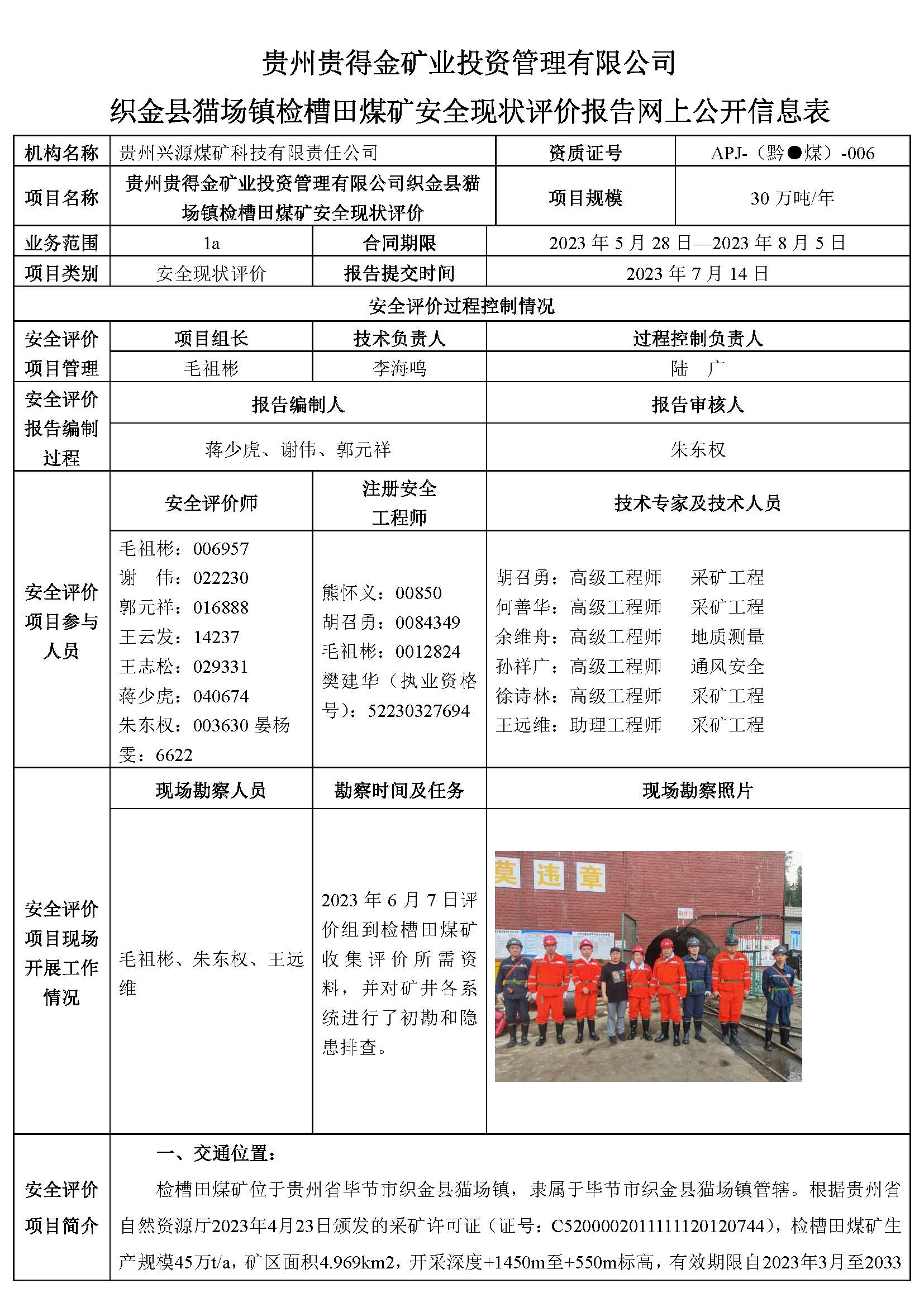 貴州貴得金礦業(yè)投資管理有限公司織金縣貓場鎮(zhèn)檢槽田煤礦安全現(xiàn)狀評價報告網(wǎng)上公開信息表