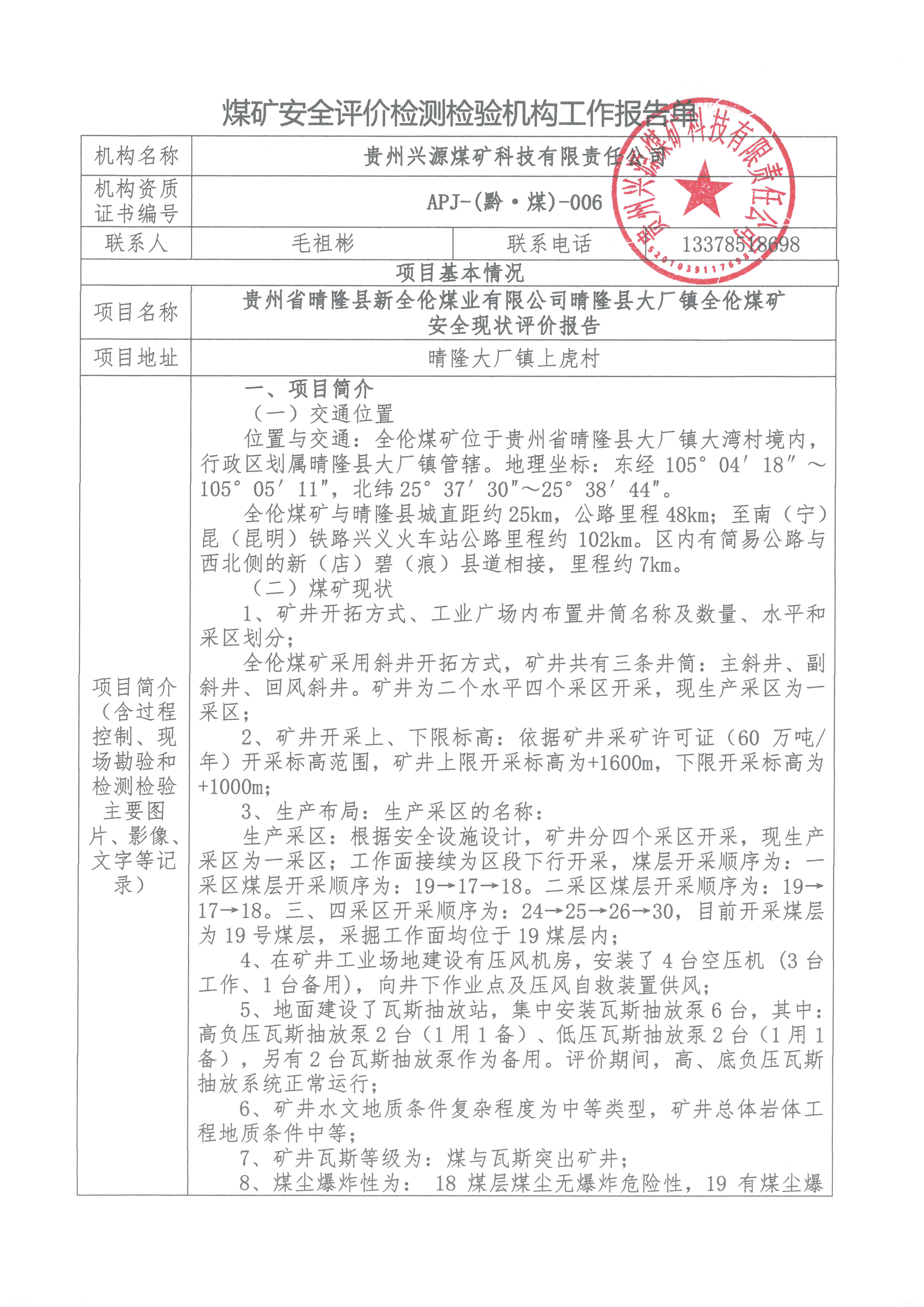 煤礦安全評價檢測檢驗機(jī)構(gòu)工作報告單【貴州省晴隆縣新全倫煤業(yè)有限公司晴隆縣大廠鎮(zhèn)全倫煤礦 安全現(xiàn)狀評價報告】
