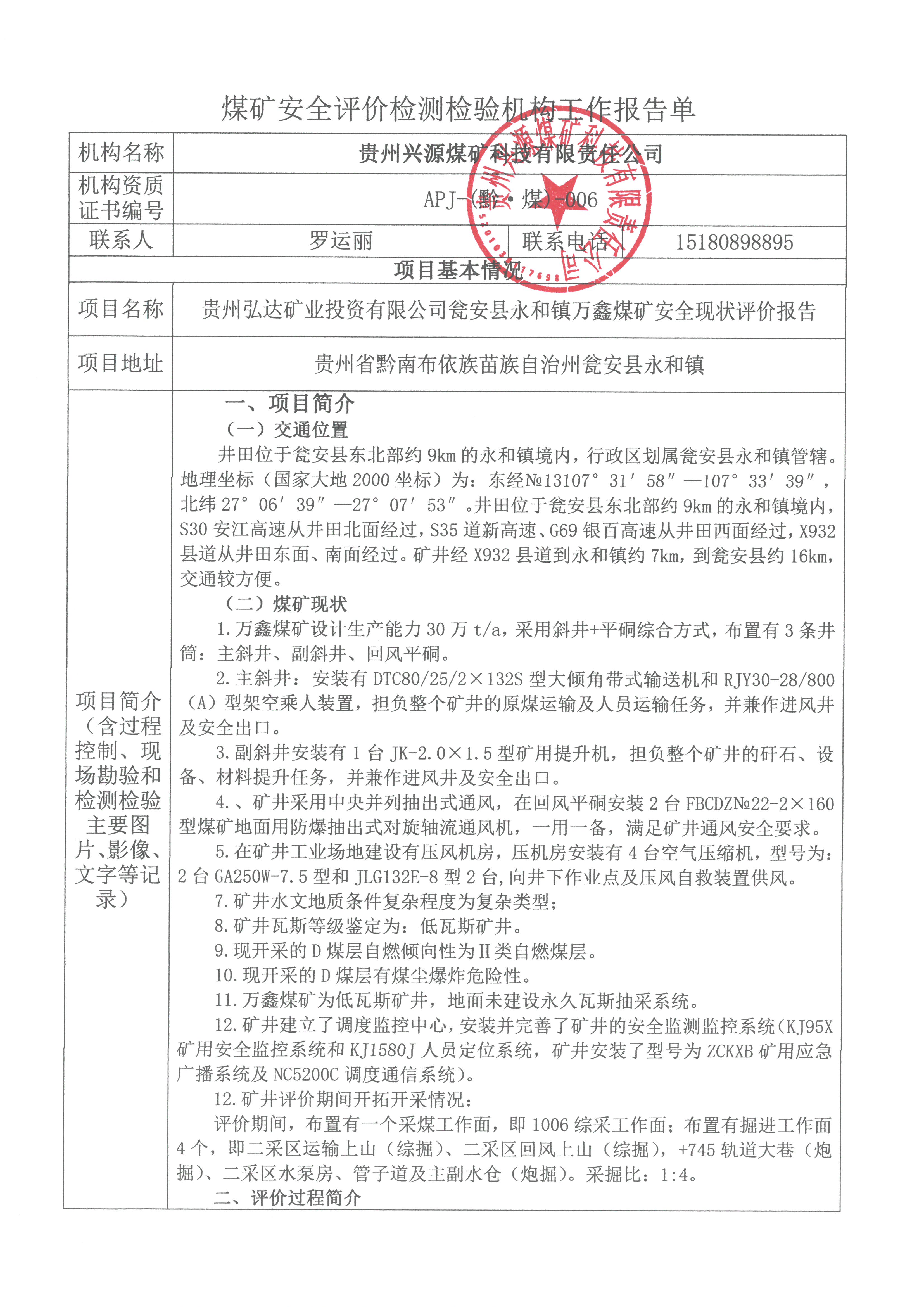 煤礦安全評價檢測檢驗機構(gòu)工作報告單【貴州弘達礦業(yè)投資有限公司甕安縣永和鎮(zhèn)萬鑫煤礦安全現(xiàn)狀評價報告】