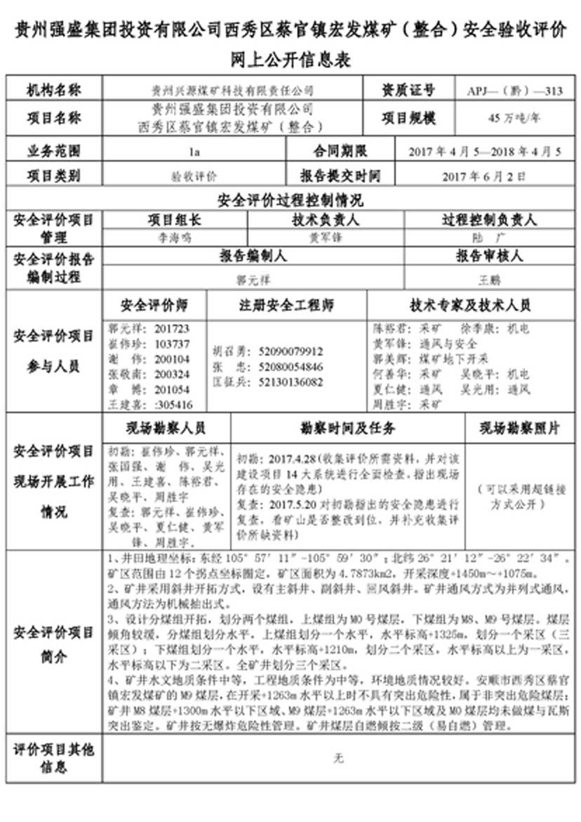 貴州強盛集團投資有限公司西秀區(qū)蔡官鎮(zhèn)宏發(fā)煤礦(整合)安全驗收評價網(wǎng)上公開信息表