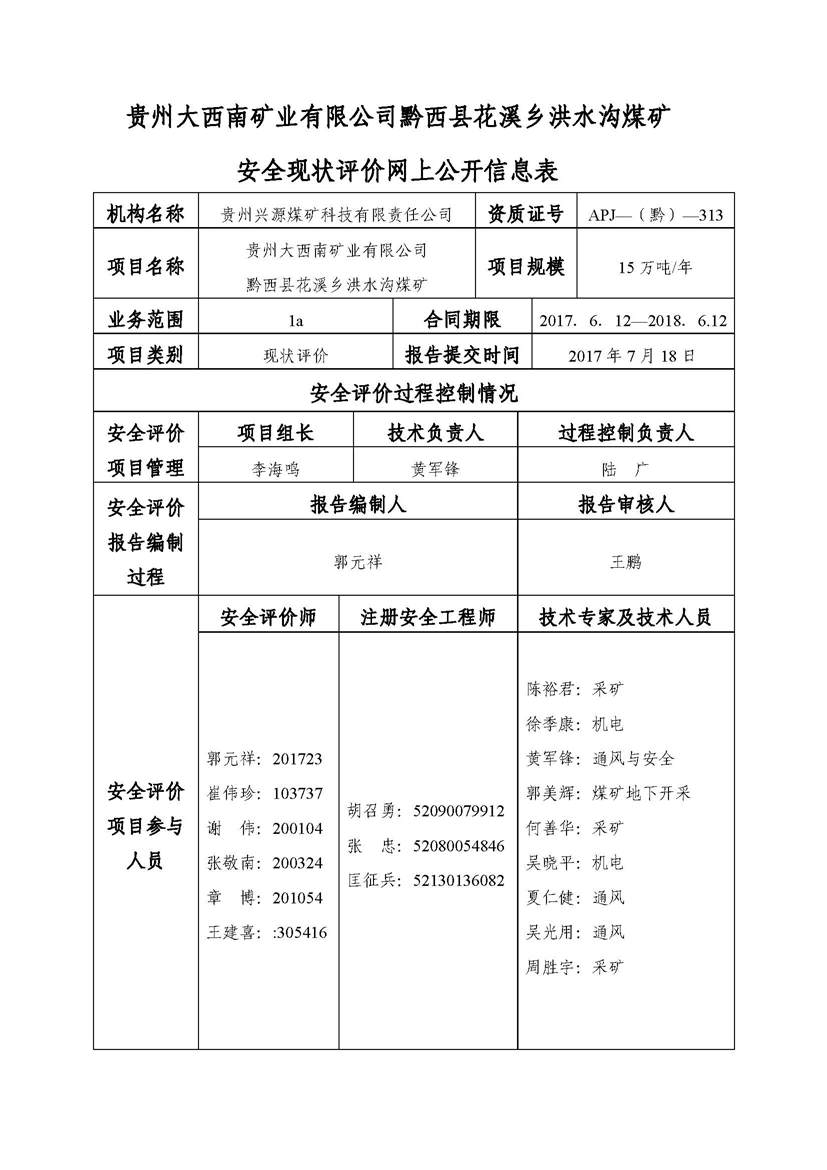 貴州大西南礦業(yè)有限公司黔西縣花溪鄉(xiāng)洪水溝煤礦安全現(xiàn)狀評(píng)價(jià)網(wǎng)上公開信息表