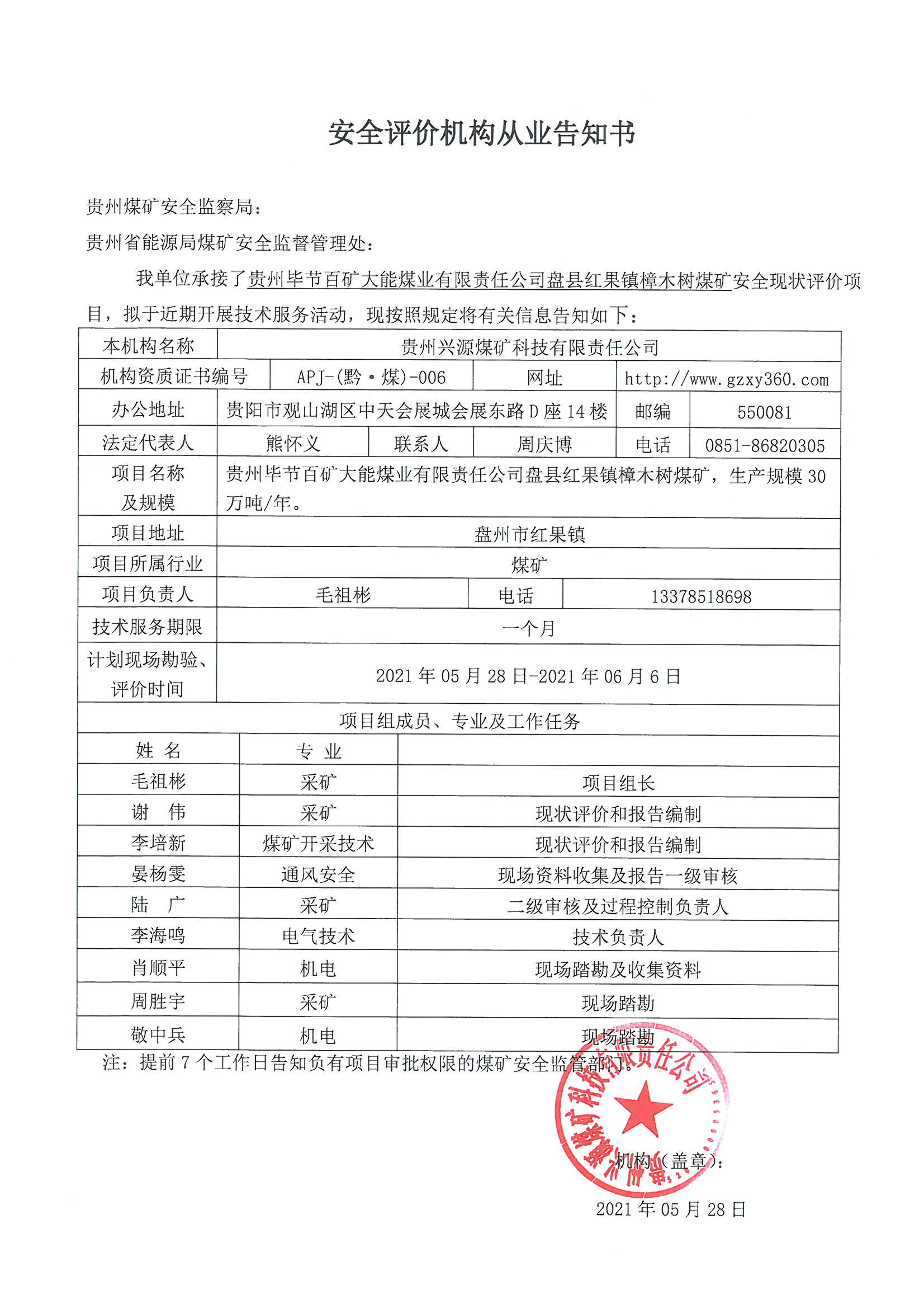 安全評價機構(gòu)從業(yè)告知書(貴州畢節(jié)百礦大能煤業(yè)有限責任公司盤縣紅果鎮(zhèn)樟木樹煤礦安全現(xiàn)狀評價)