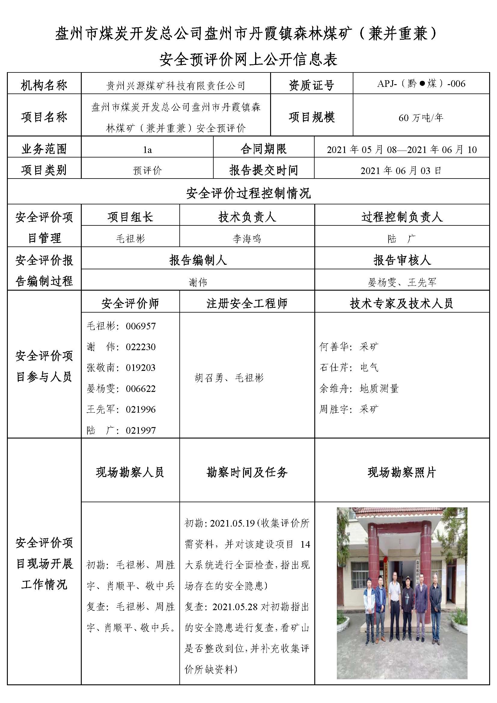 盤州市煤炭開發(fā)總公司盤州市丹霞鎮(zhèn)森林煤礦(兼并重兼)安全預評價網(wǎng)上公開信息表